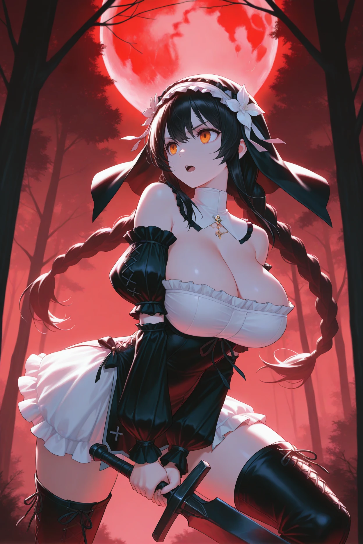 Add "black veil, hair flower, detached collar, necklace, detached sleeves, puffy sleeves, black sleeves, bare shoulders, frills, cleavage, black and white dress, black dress, short dress, black thigh boots" for her default look.