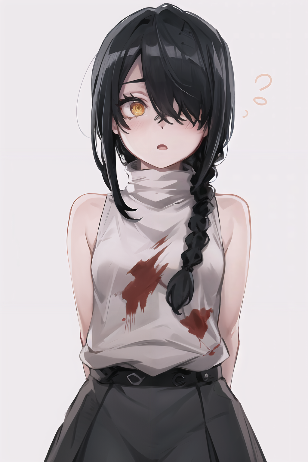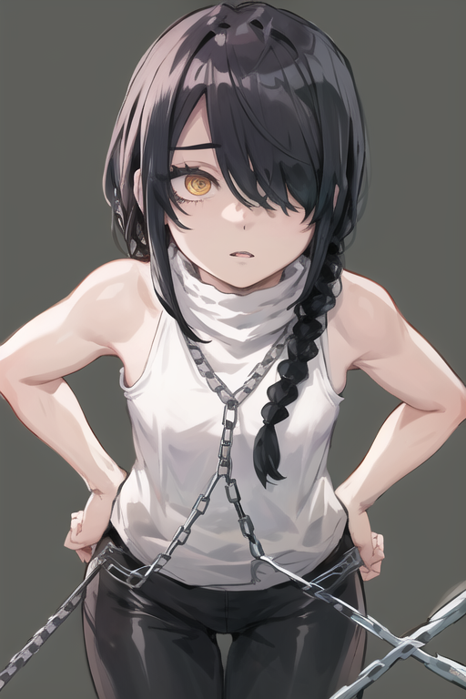 Hair: single braid, hair over one eye, black hair, or short hair and hair between eyes (for her first appear in the manga)
