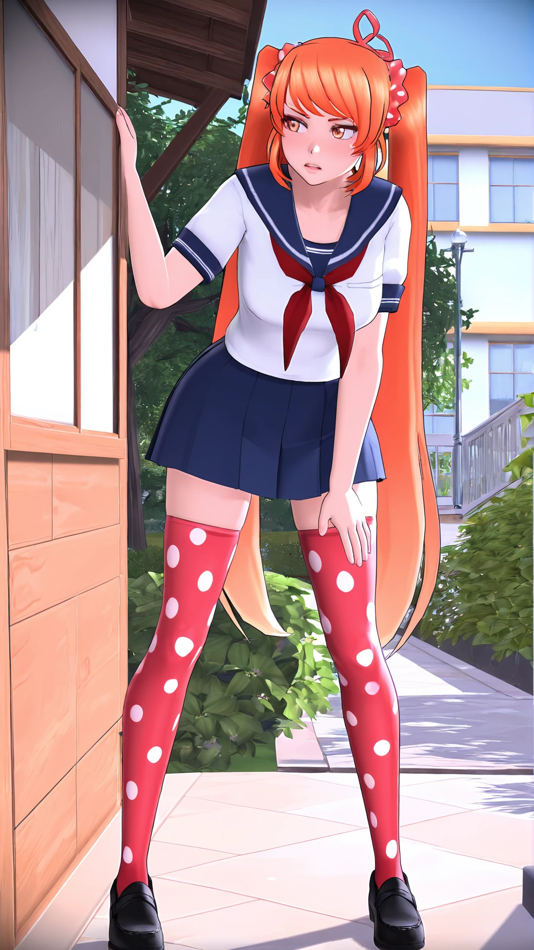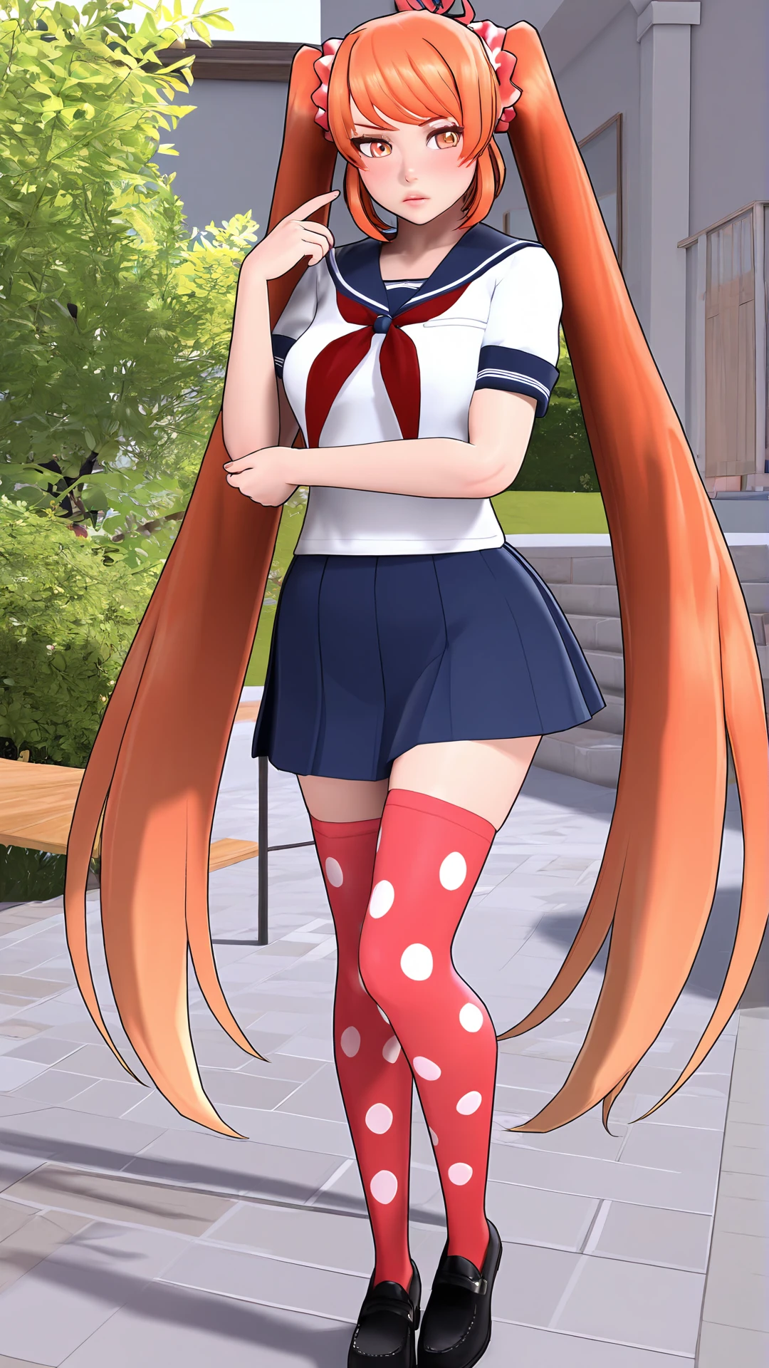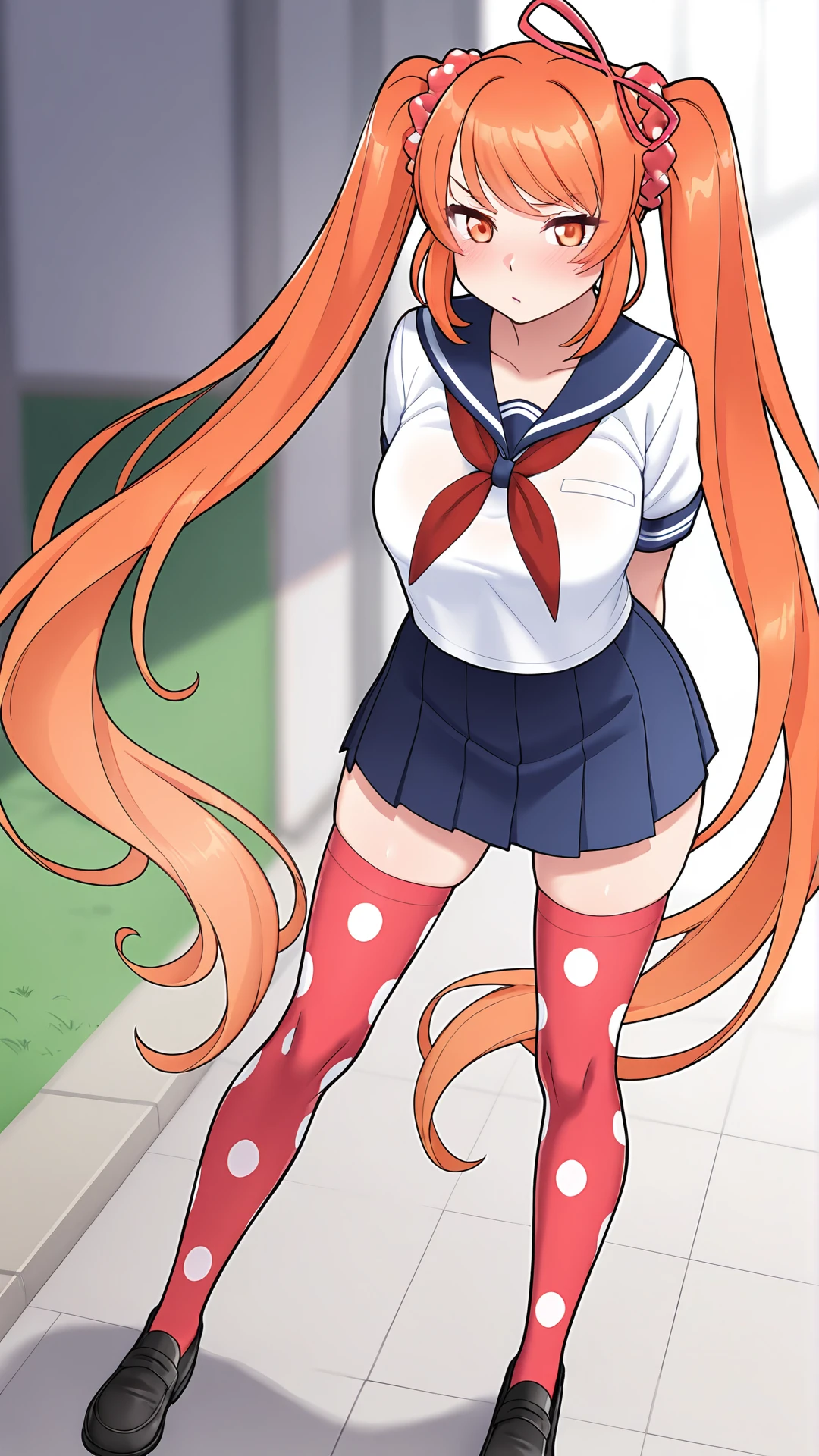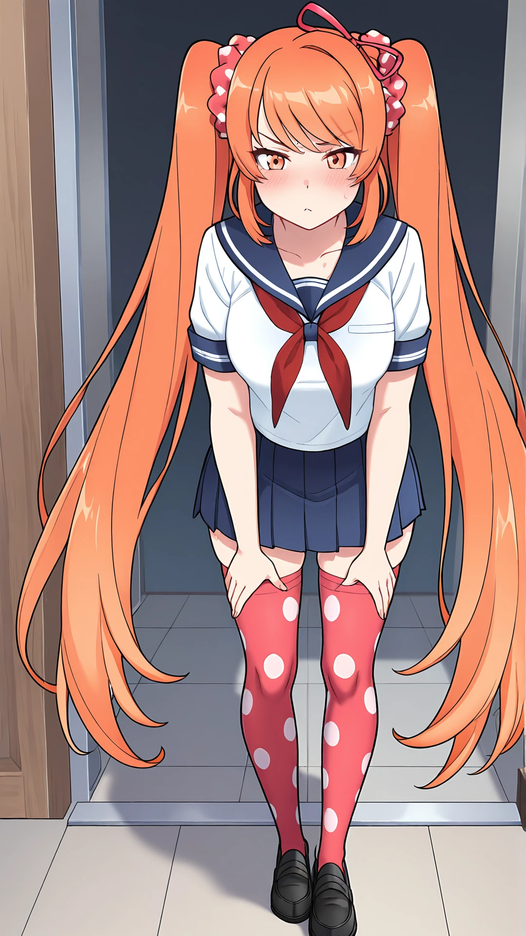 Osana Najimi,1girl,solo,very long hair,orange hair,twintails,ahoge,orange eyes,scrunchie,short sleeves,white shirt,sailor collar,neckerchief,school uniform,serafuku,pleated skirt,blue skirt,polka dot,breasts,thighhighs,red thighhighs,zettai ryouiki,black footwear,shoes,