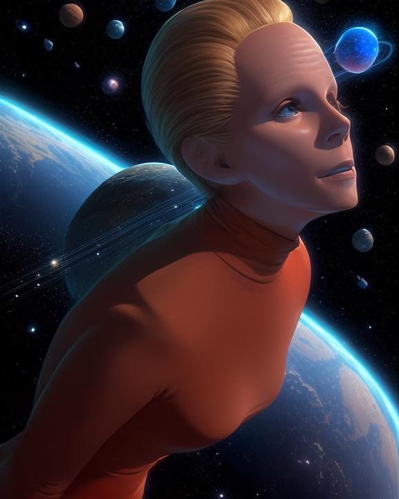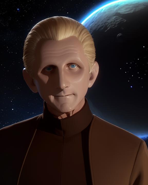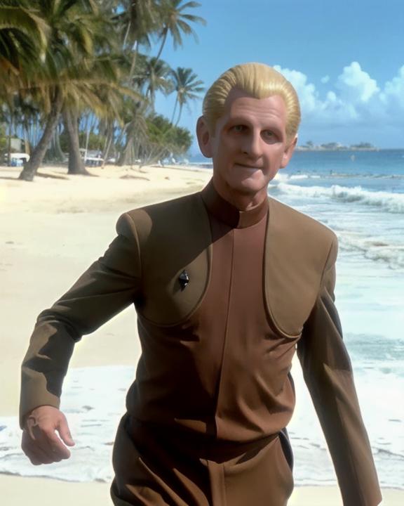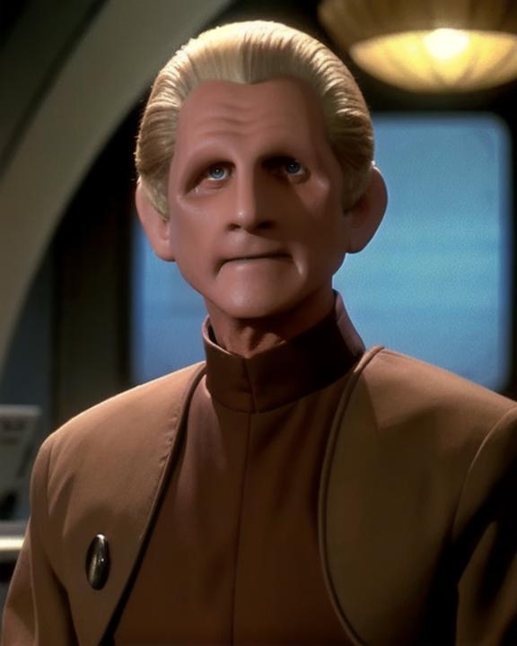 The prompt code is ds9changeling. Other prompts that help: [odo | femalechangeling], skin like clay, featureless face, featureless ears, no eyebrows, slicked back blond hair, wearing [tan bajoran uniform | orange coral color dress]. The actors' names are also tagged to help generate them.