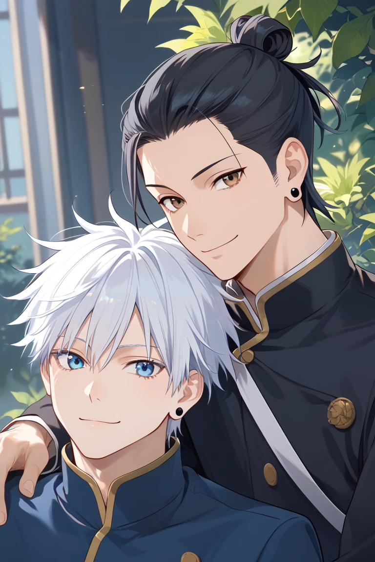 jjk, ((2boys)), satoru gojo, short hair, white hair, blue eyes, suguru geto, tied hair, black hair, brown eyes, blue earrings