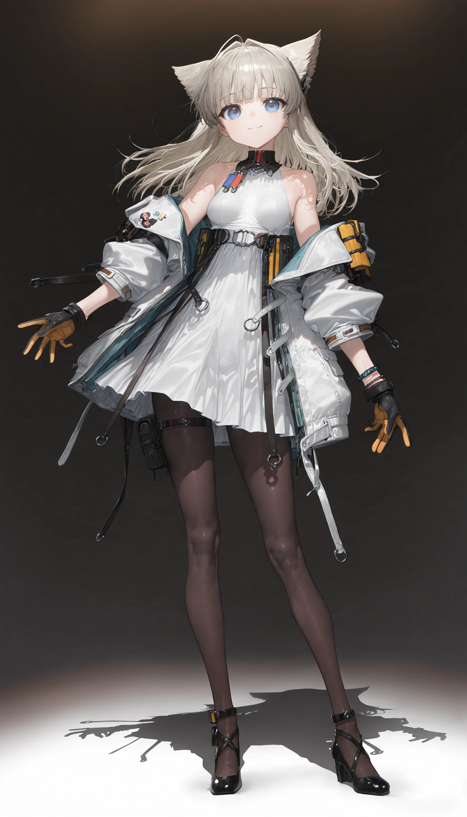 open jacket ,sleeveless dress,black gloves,black pantyhose,high heels,belt ,