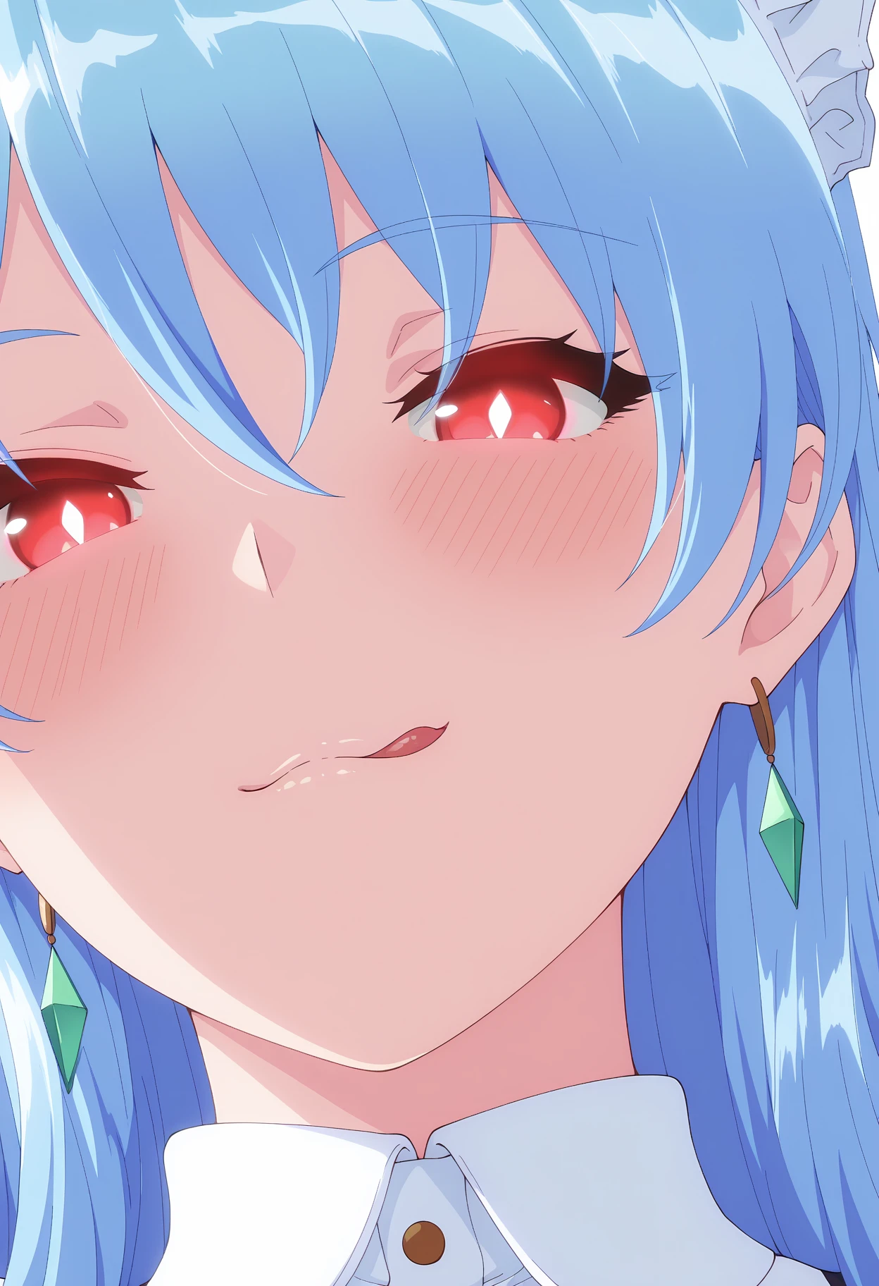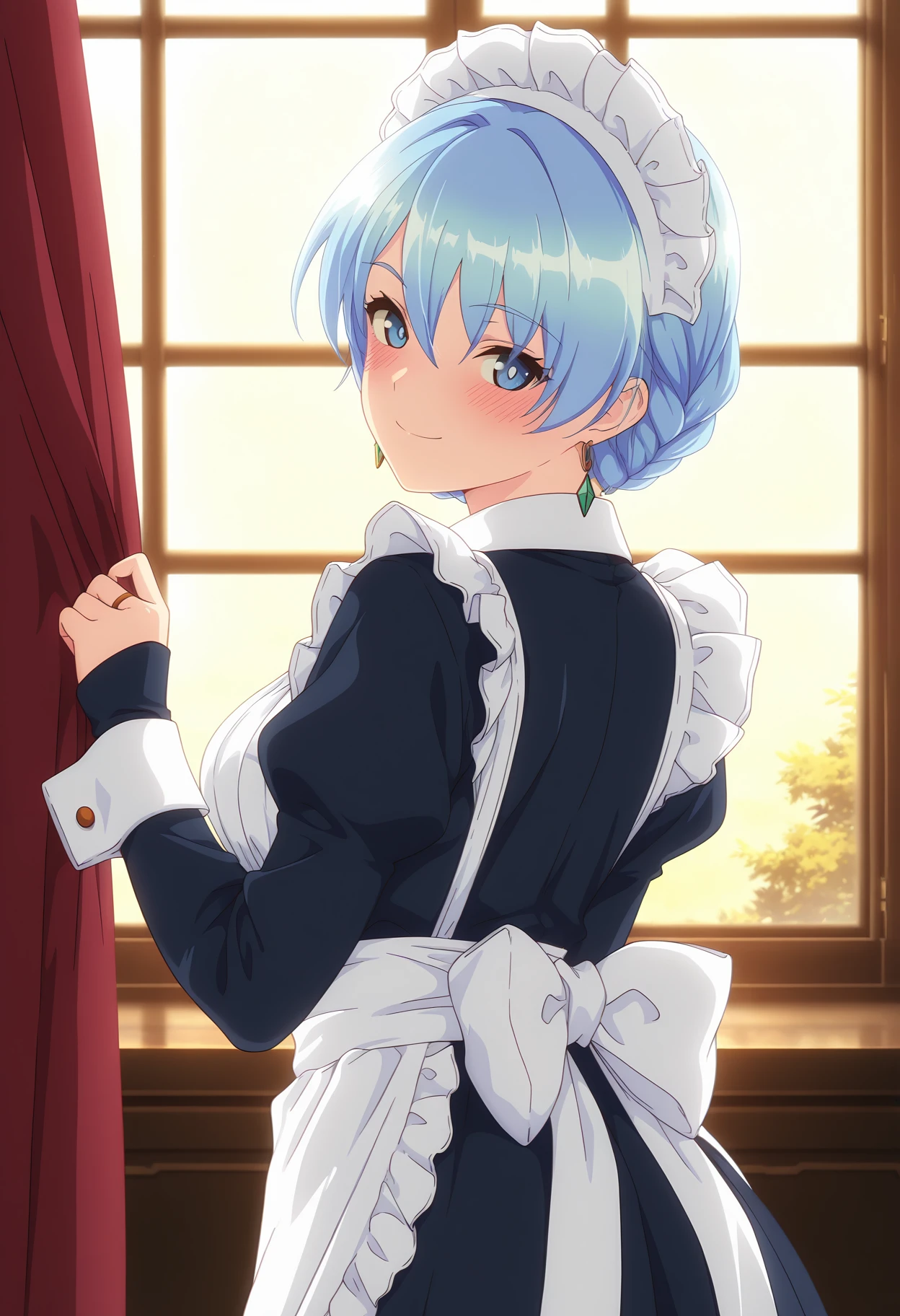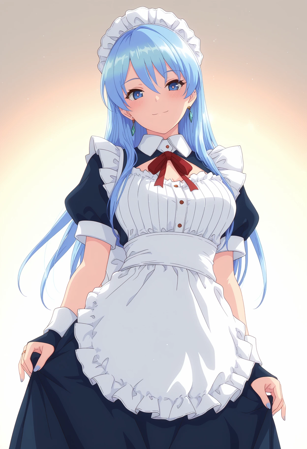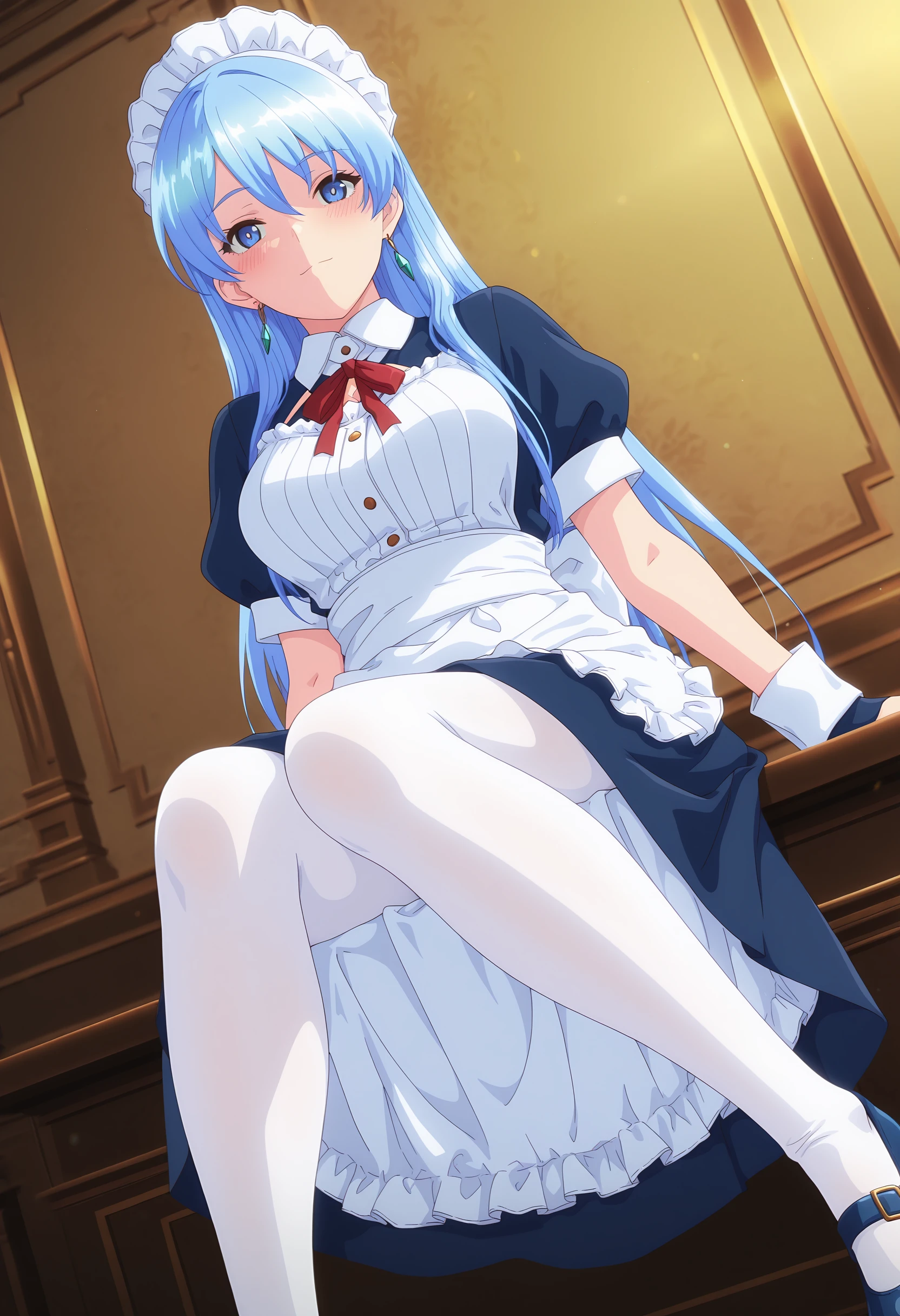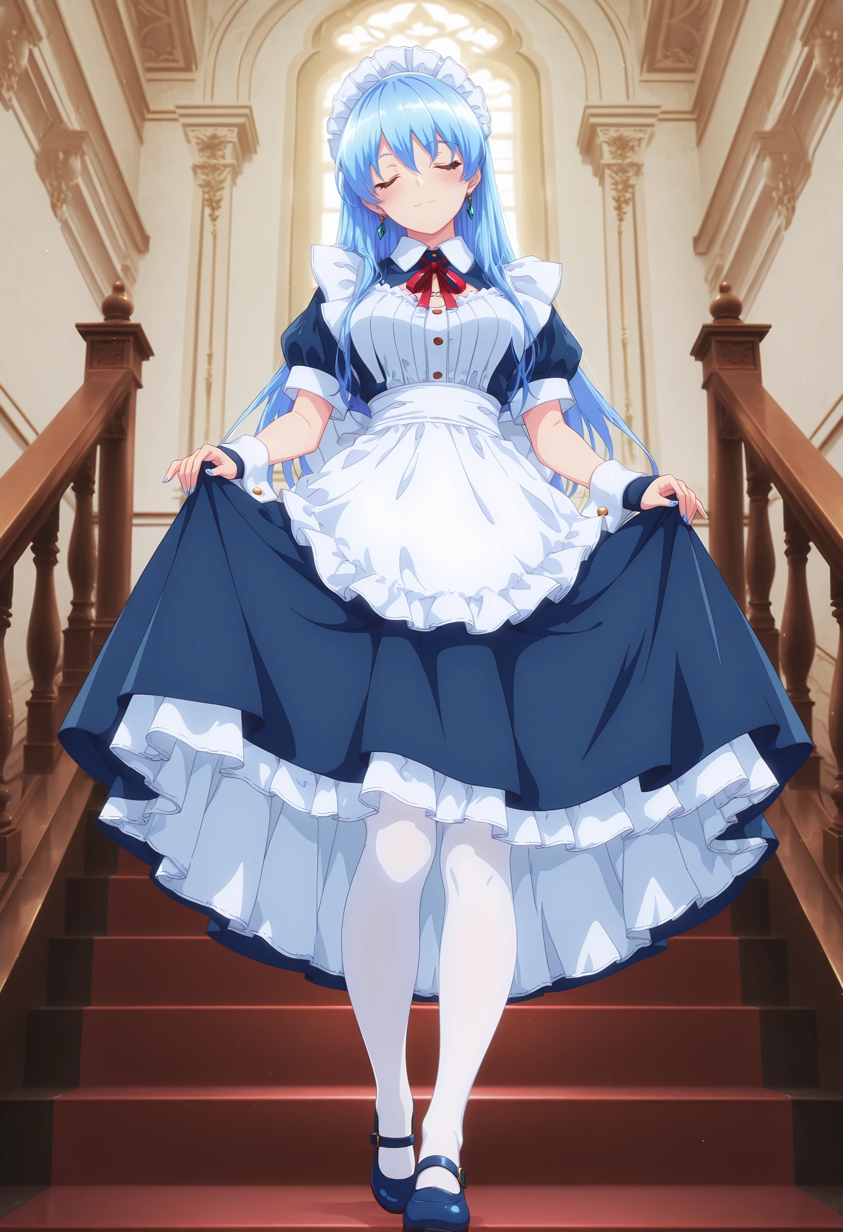 maid, maid headdress, maid apron, red neck ribbon, long skirt, frills, white pantyhose, puffy short sleeves,