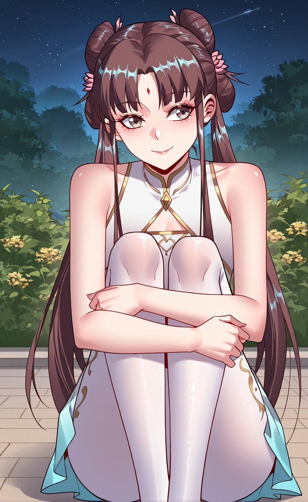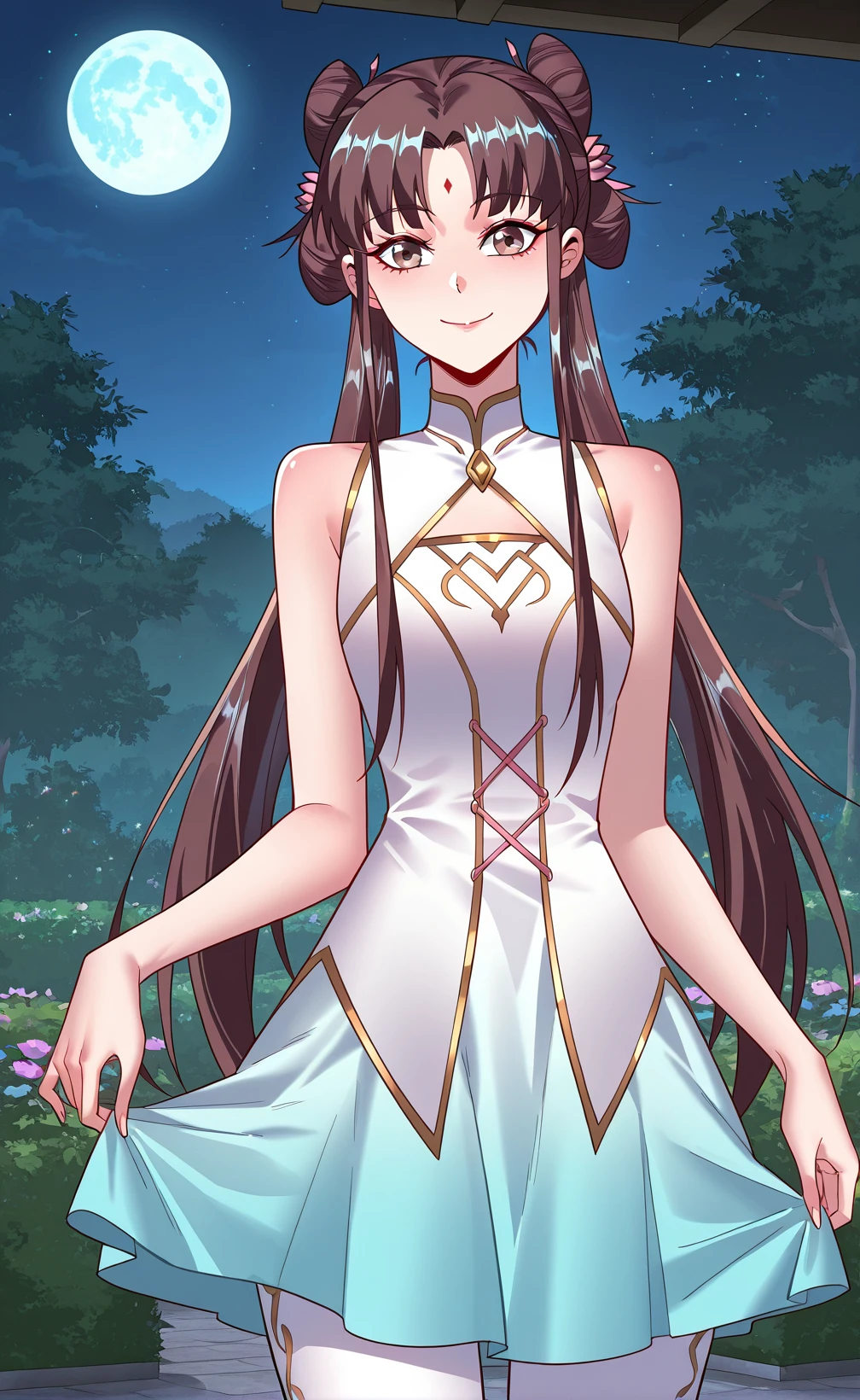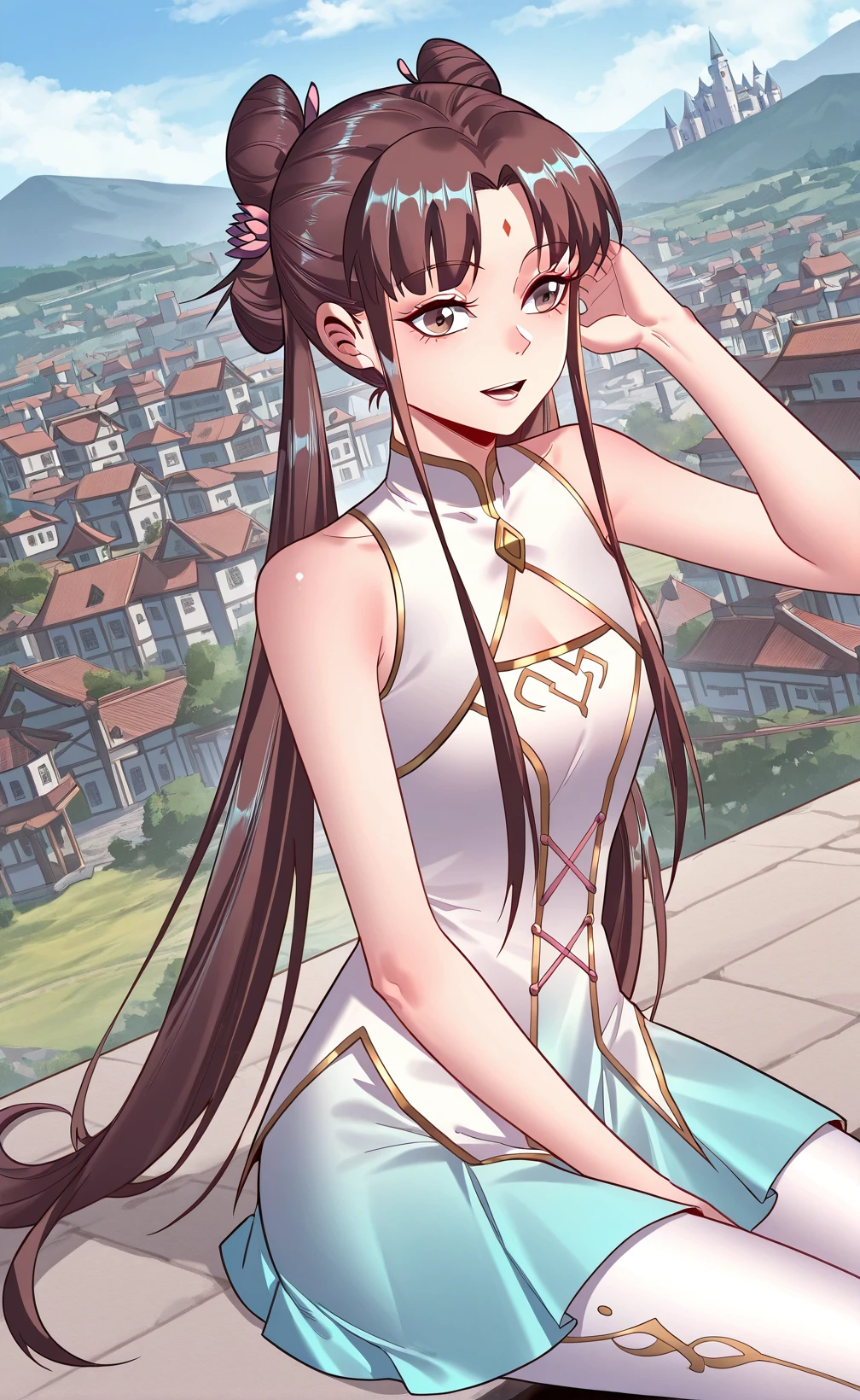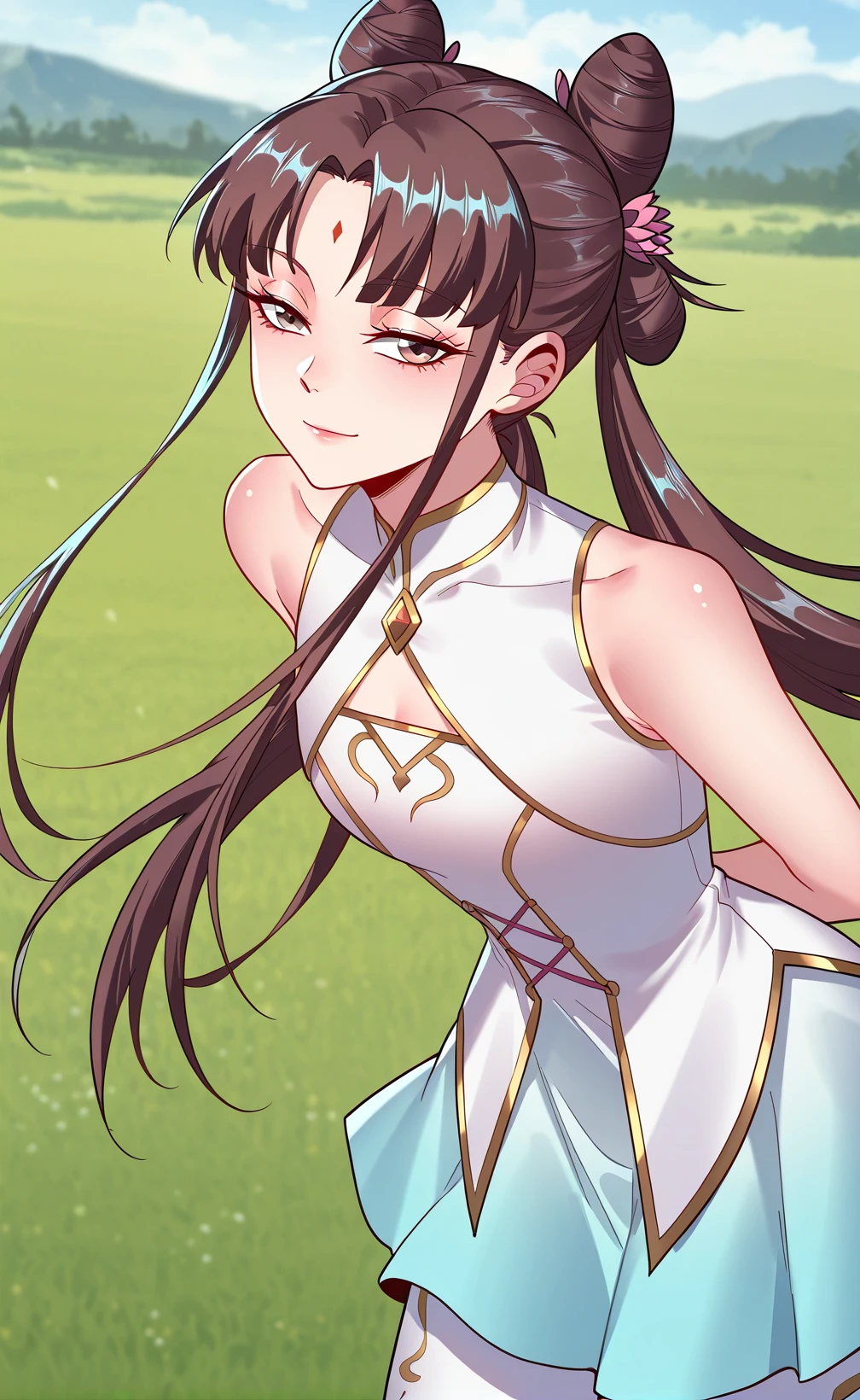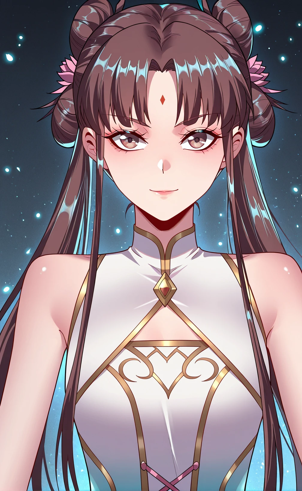 Xianer, 1girl, solo, brown eyes, brown hair, long hair, straight bangs, parted bangs, long sidelocks, twin buns, twin low ponytail, hair ornament, forehead mark,