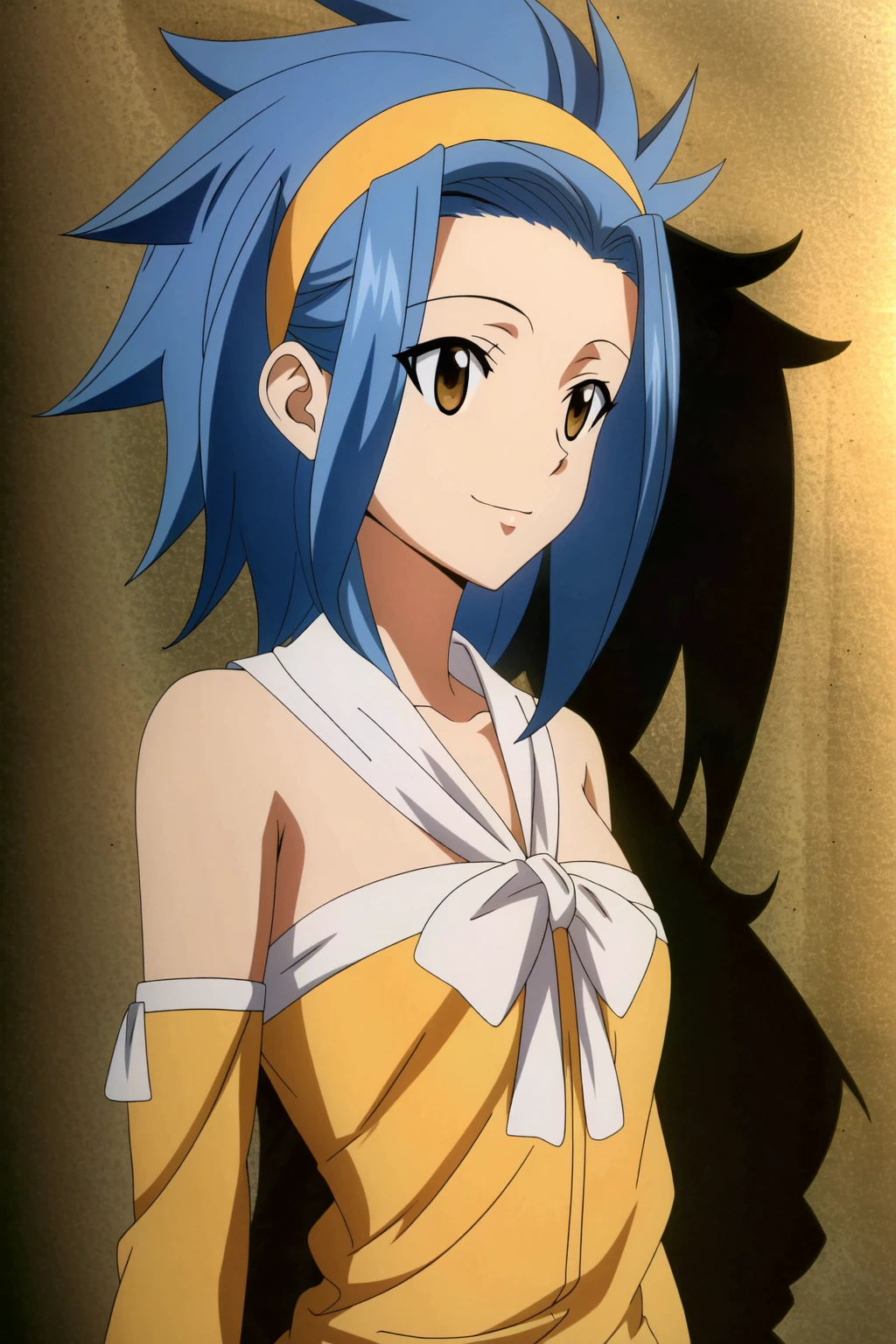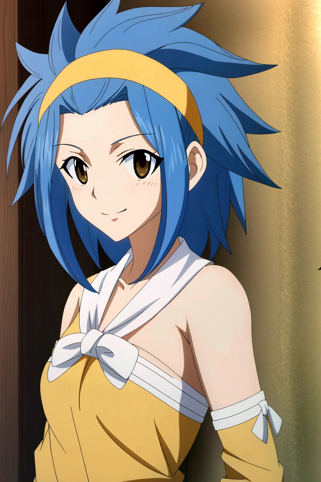 Levy McGarden, blue hair, smile, 1girl, brown eyes, hairband, looking at viewer, orange hairband, short hair, bare shoulders