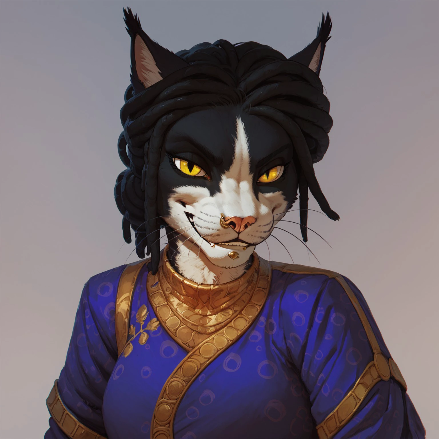 3mb3r, feline, black and white fur, yellow eyes, black hair, nose ring, chin piercing,