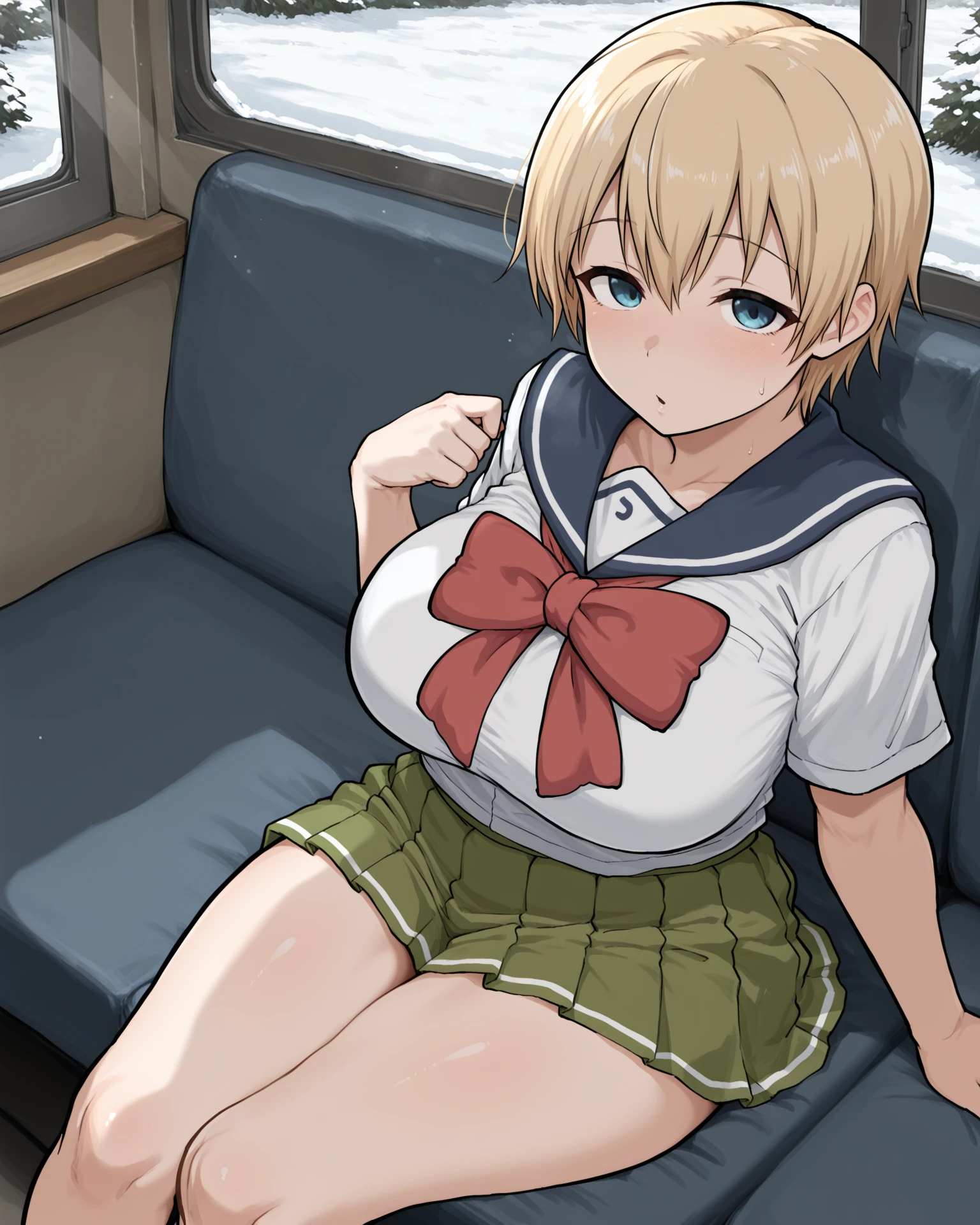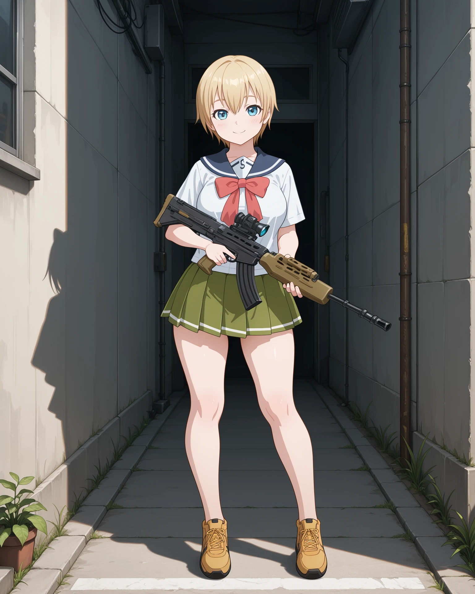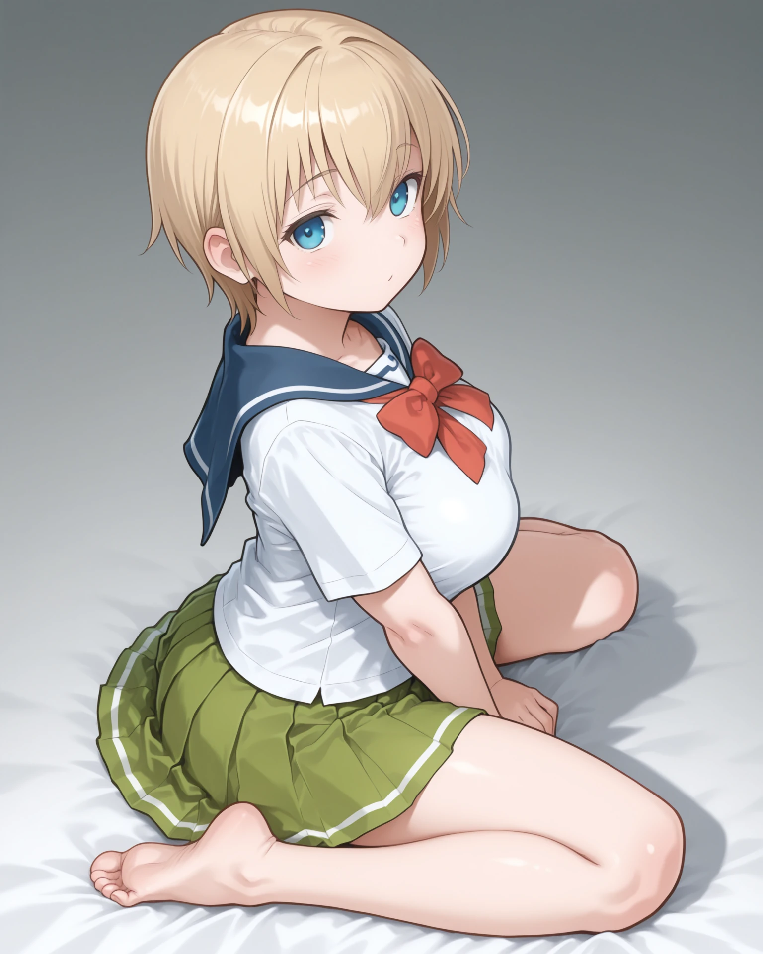 upottel85a1, blue eyes, blonde hair, short hair, large breasts, school uniform, sailor collar, white shirt, short sleeves, red bowtie, green skirt, pleated skirt, bare legs, sneakers