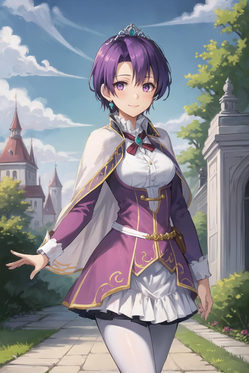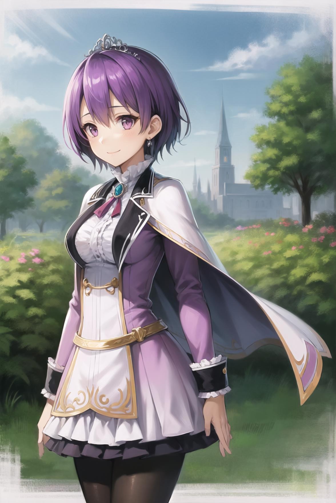 <lora:Klaudia-08:0.8>, Klaudia von Auslese, purple_hair, short_hair, purple_eyes, small_breasts, timid, (shy:0.8), light_purple_shirt, short_white_dress, black_pantyhose, jewelry, silver tiara, cape