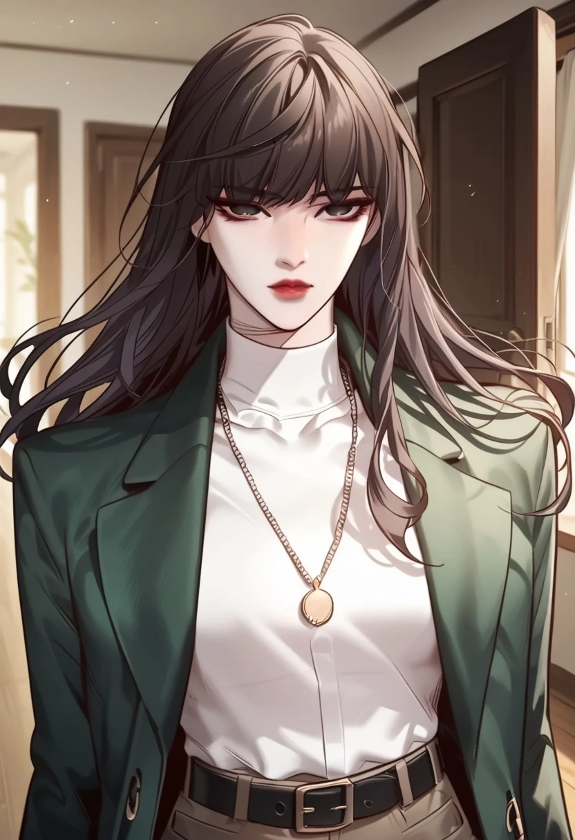outfit1, ponytail, long sleeves, pantyhose, black sweater, turtleneck, black pants, belt, black jacket,outfit2, jacket, collared shirt, black necktie, shirt, pants, black pants, long sleeves, formal,outfit3, necklace, white shirt, cardigan, black belt, brown pants, long sleeves,Cheers!