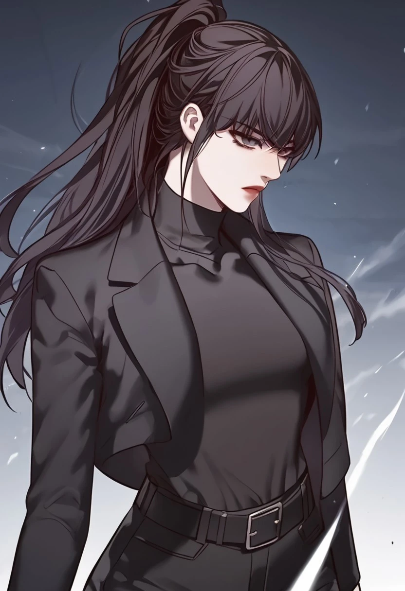 outfit1, ponytail, long sleeves, pantyhose, black sweater, turtleneck, black pants, belt, black jacket,