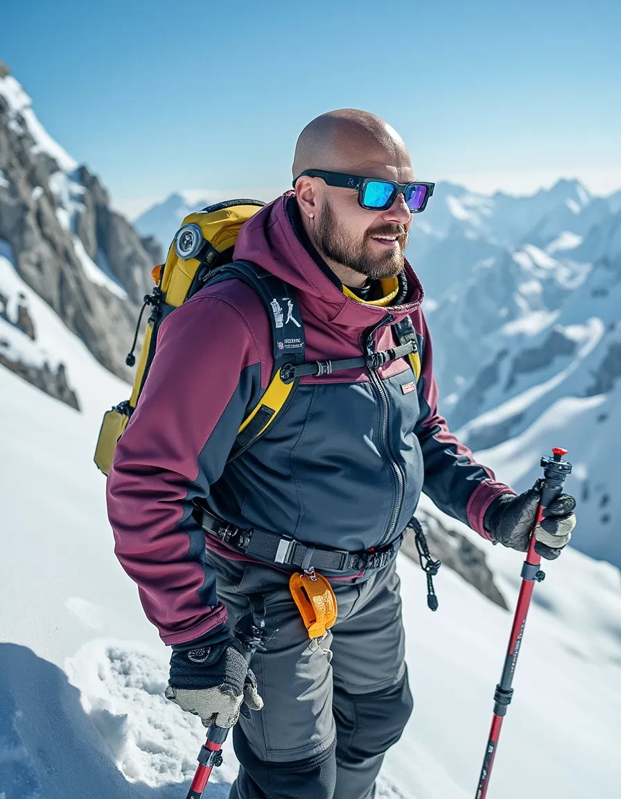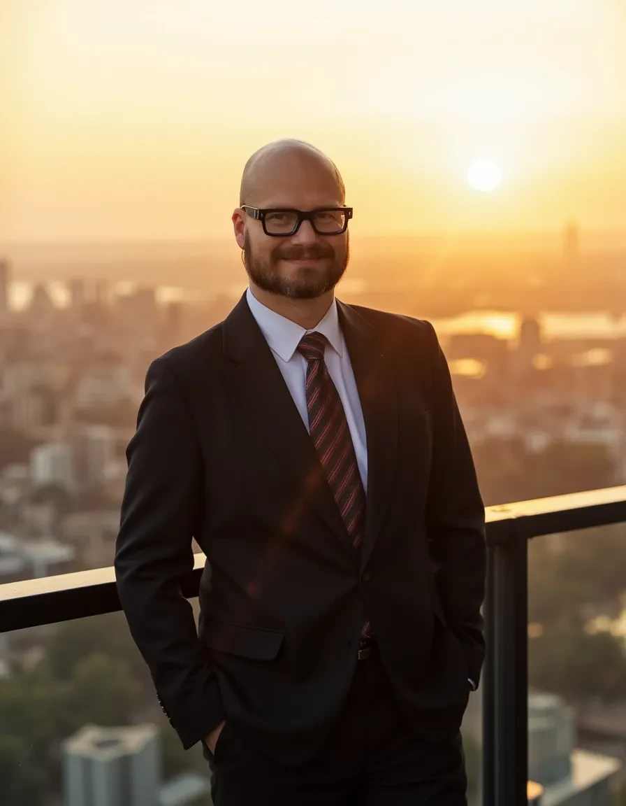 A model of a charismatic 40-year-old bald man in fashionable augmented reality glasses, trained on high-quality professional photographs.