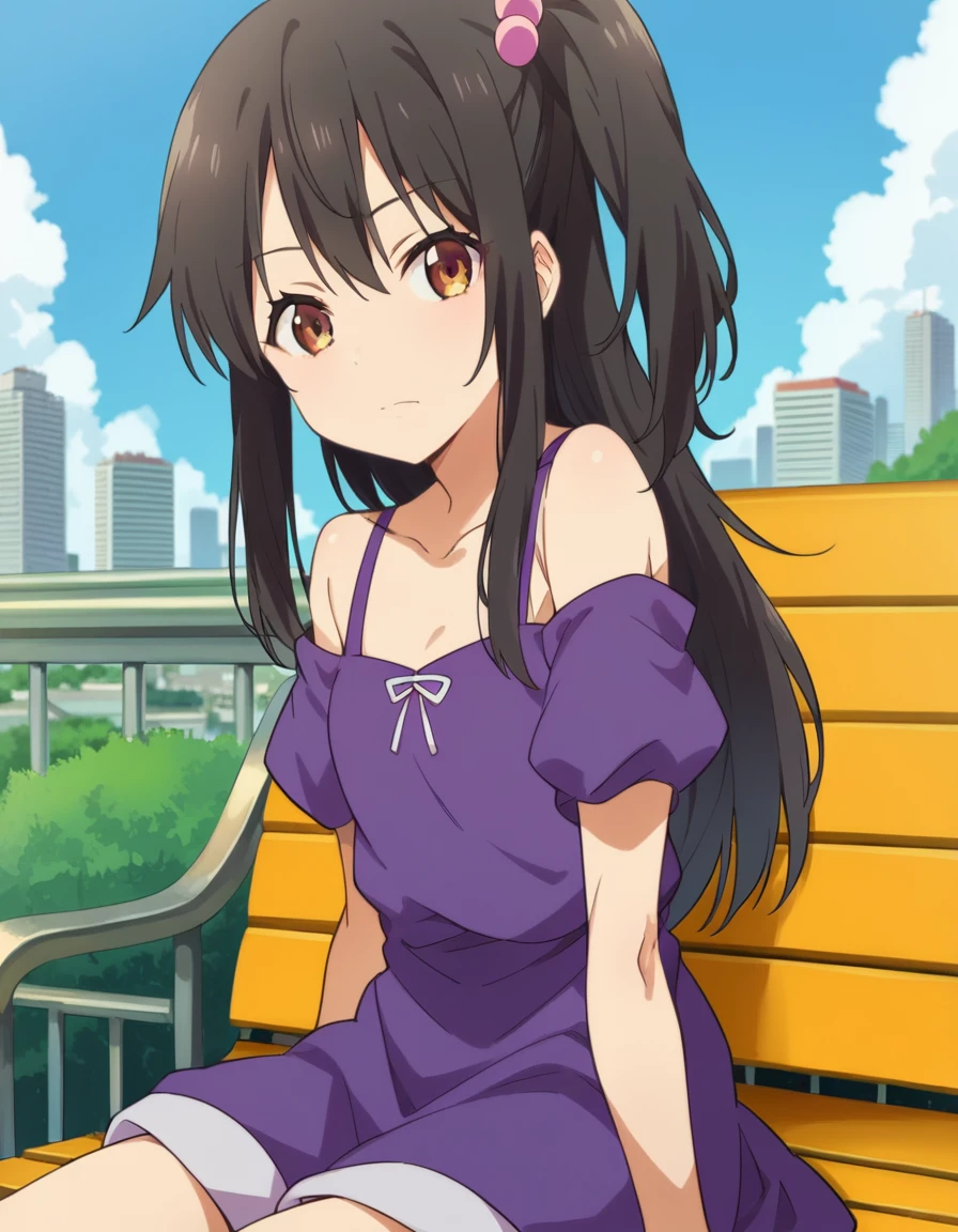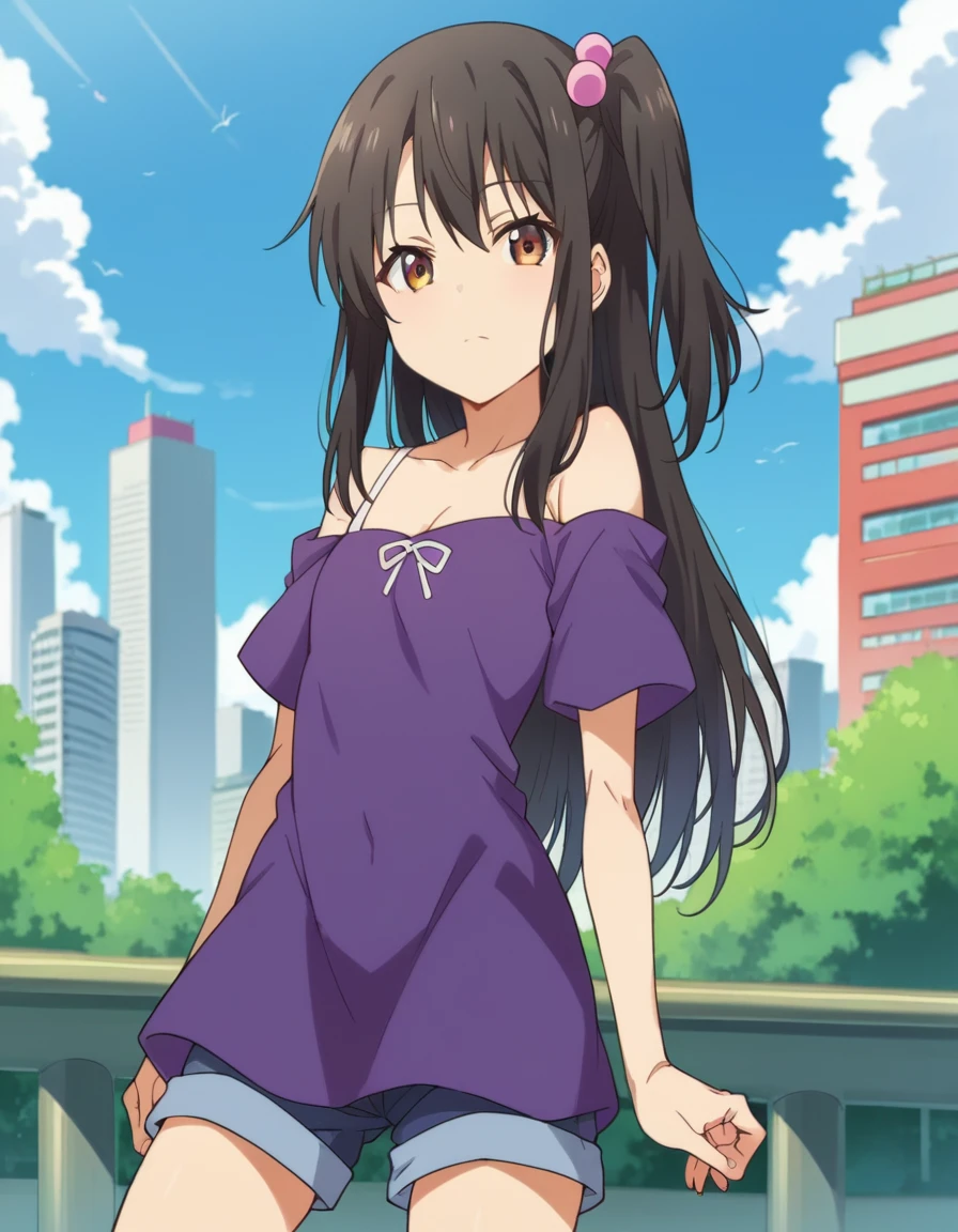 tenka adachi, black hair, (brown eyes:1.3), side ponytail, long hair, hair bobbles,