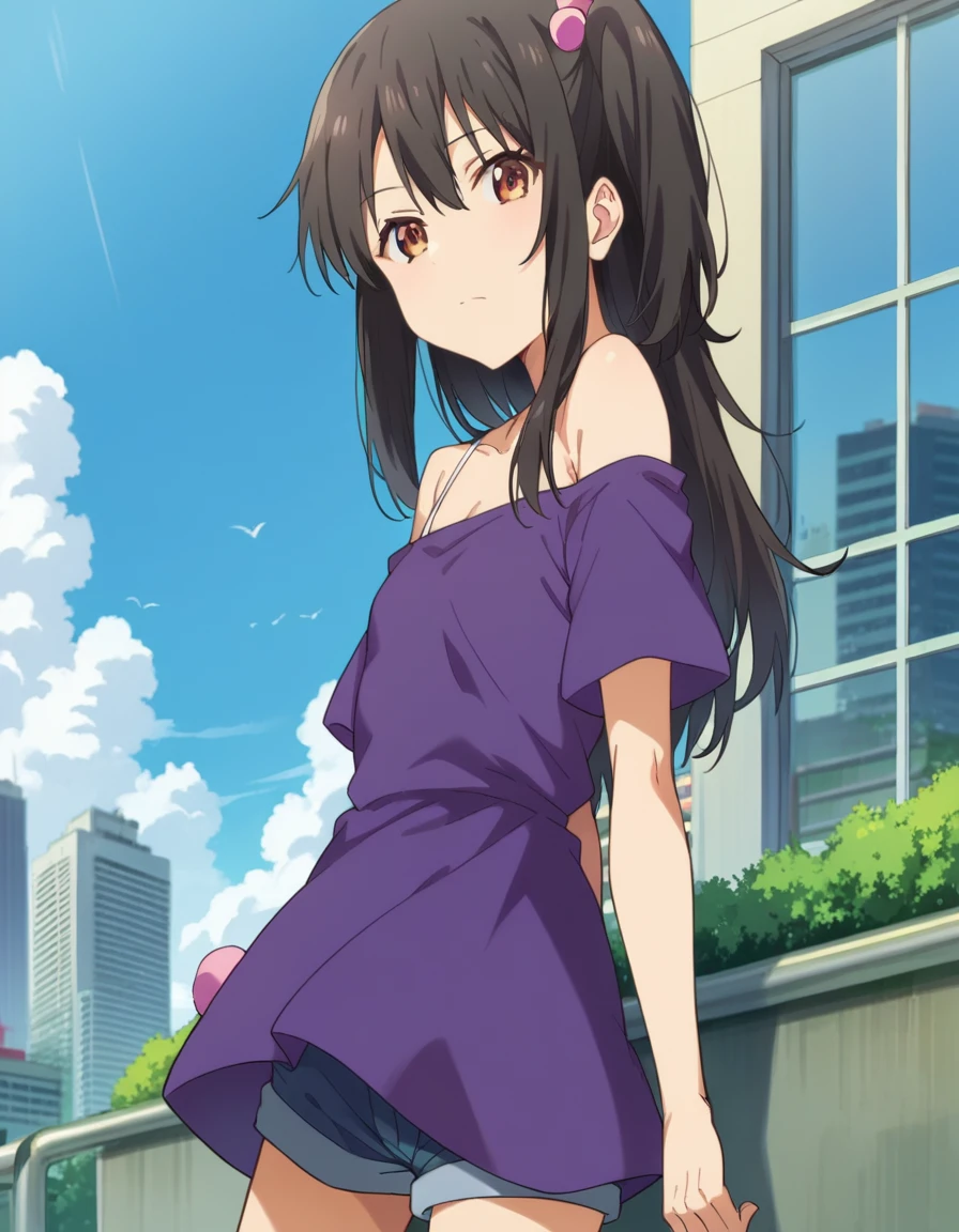 tenka adachi, black hair, brown eyes, side ponytail, long hair, hair bobbles,