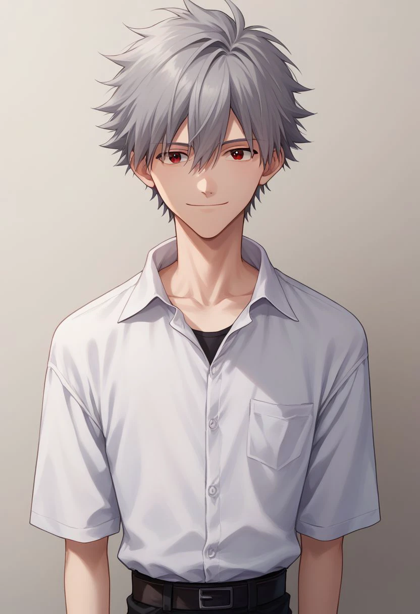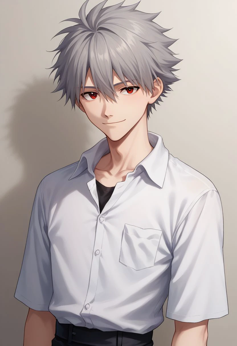 Casual #1: kaworu, 1boy, grey hair, red eyes, white shirt, black pants,