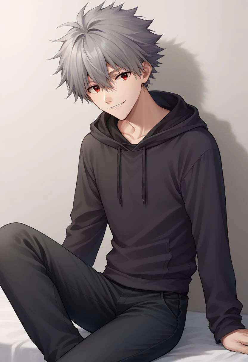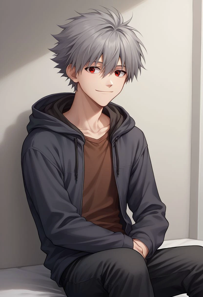 Casual #2: kaworu, 1boy, grey hair, red eyes, hoodie, hood, black pants. Hood can be up or down.