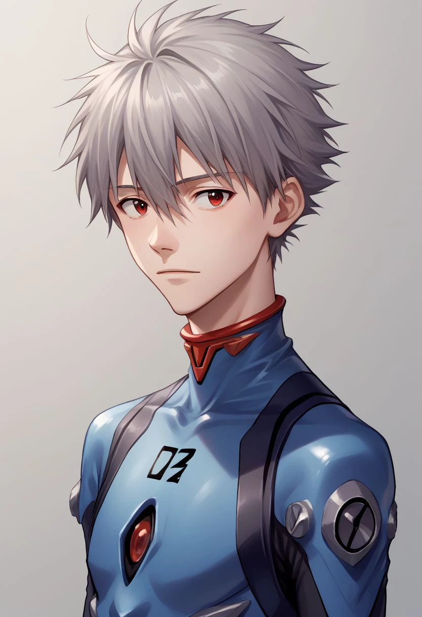 Plugsuit: kaworu, 1boy, grey hair, red eyes, plugsuit, bodysuit,