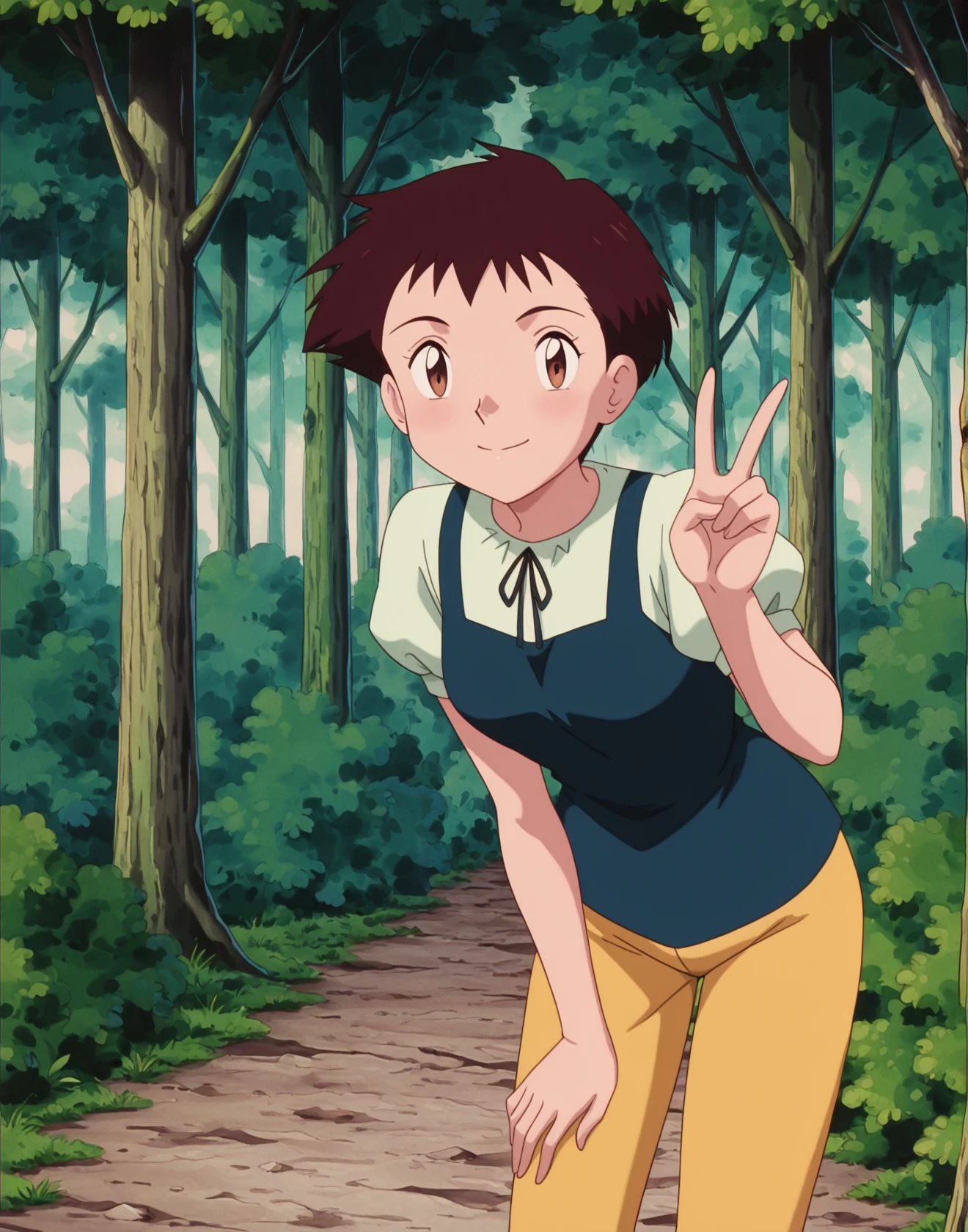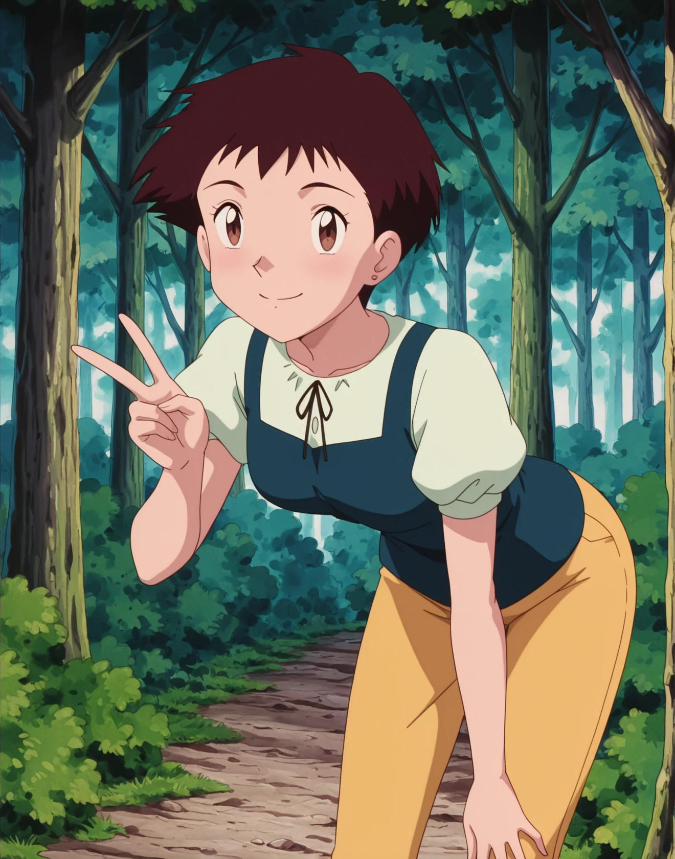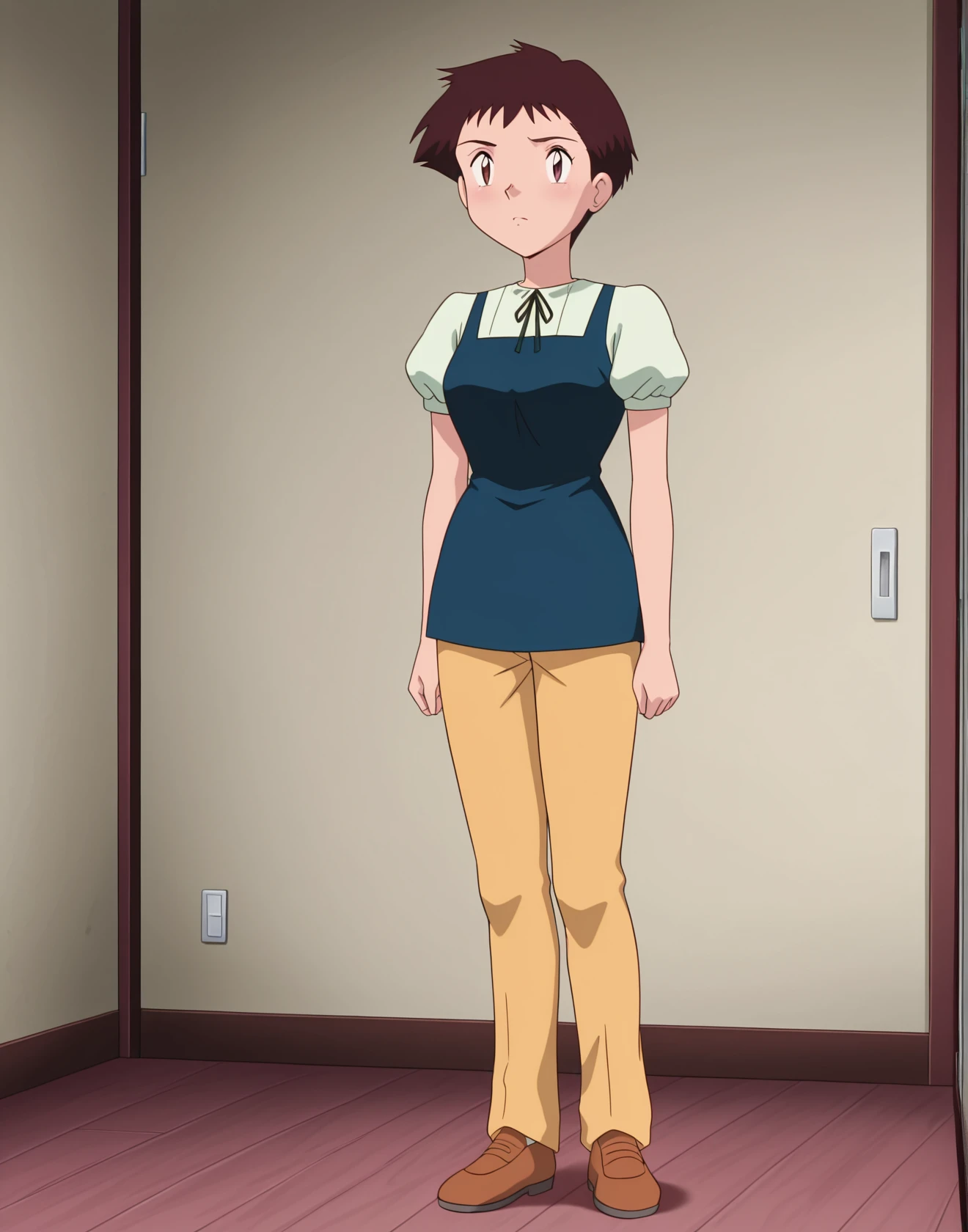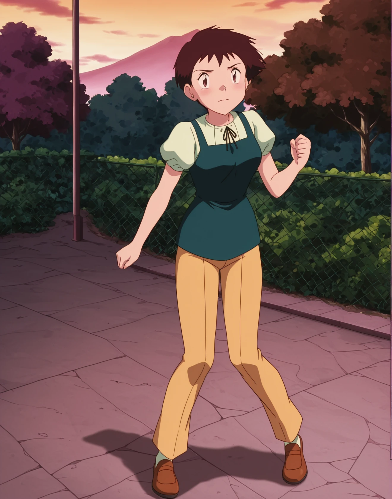pkmArielle, short hair, brown hair, short sleeves, yellow pants, brown eyes,