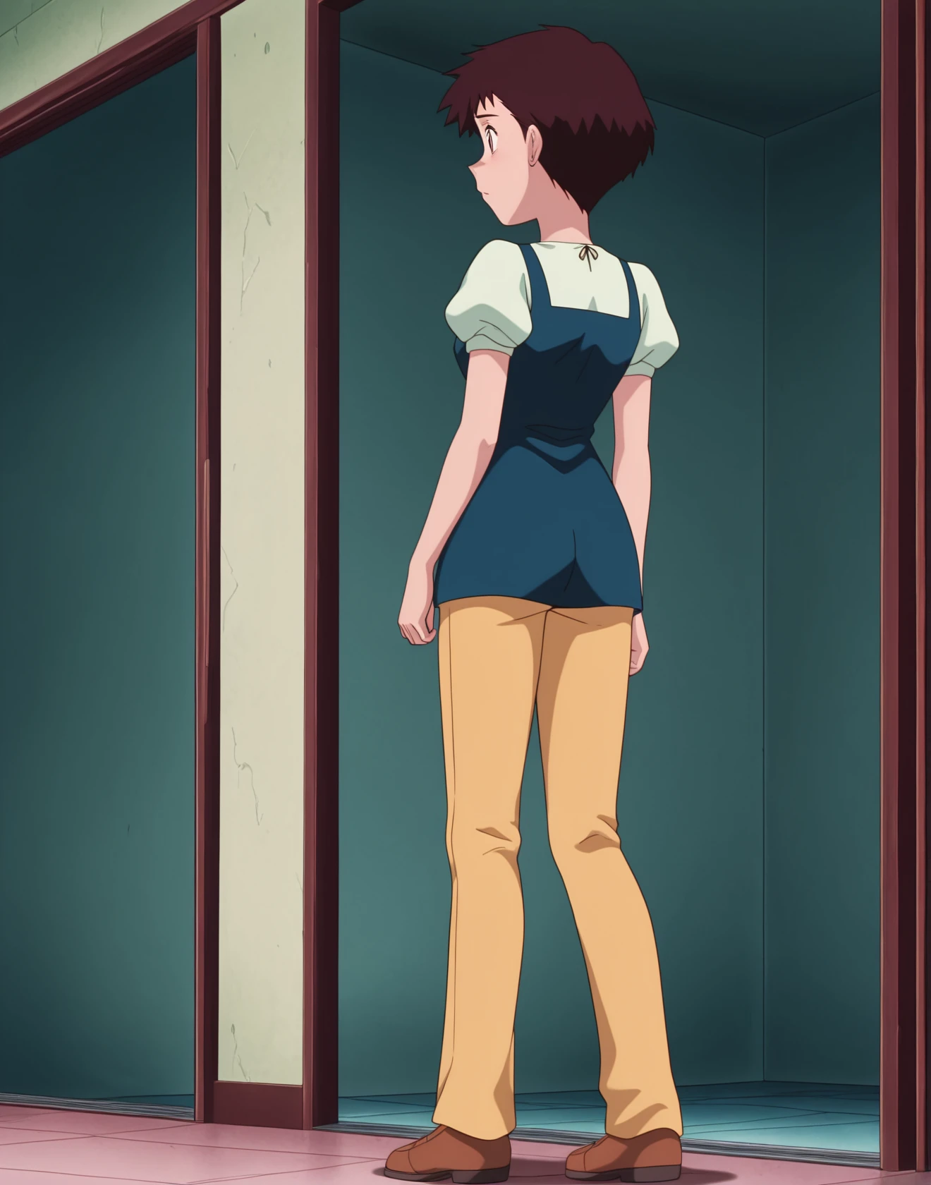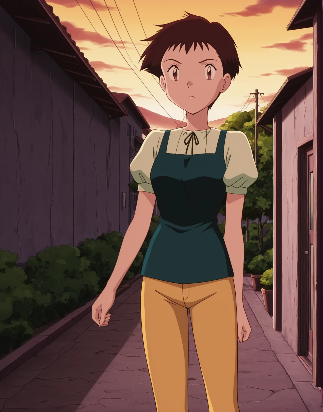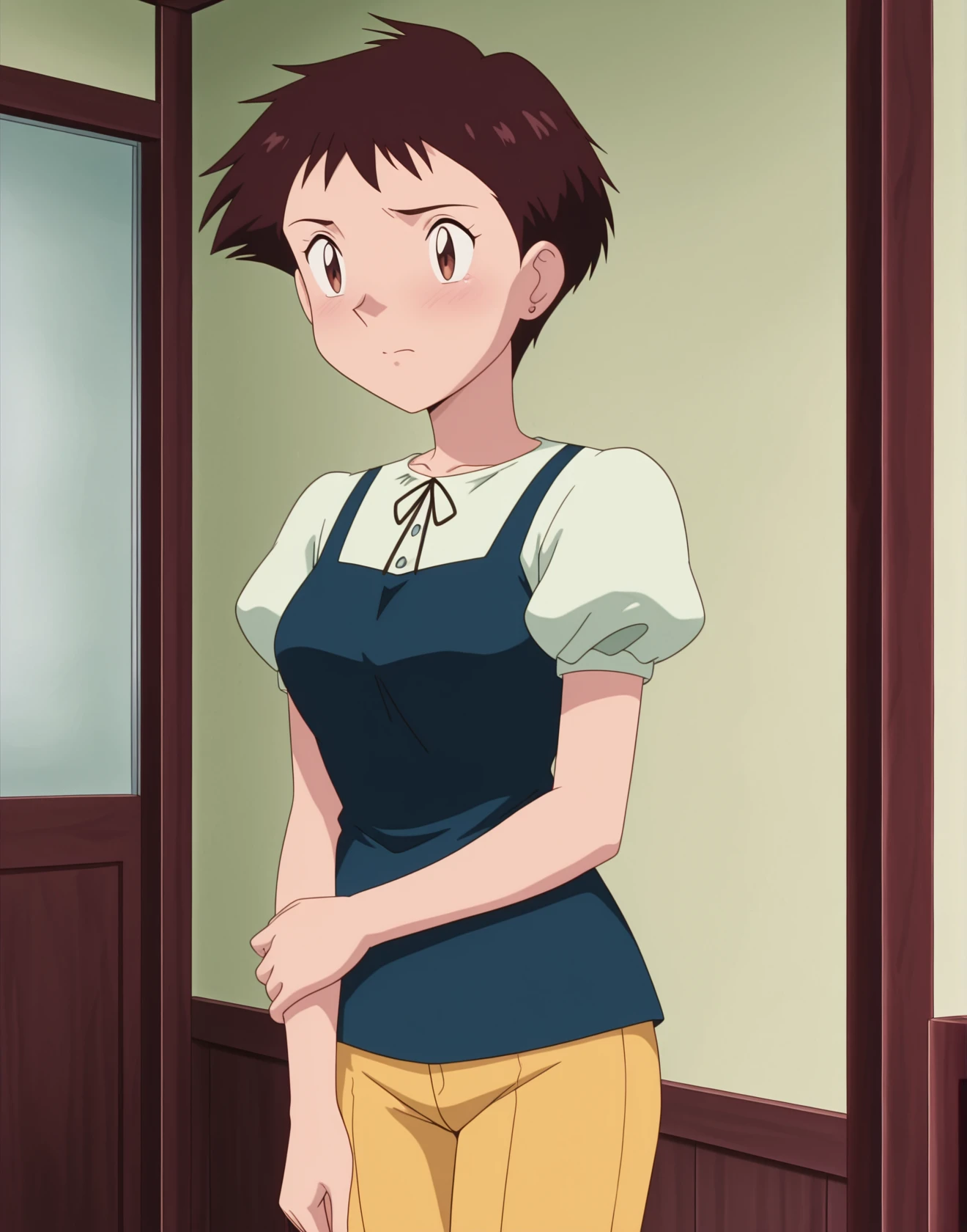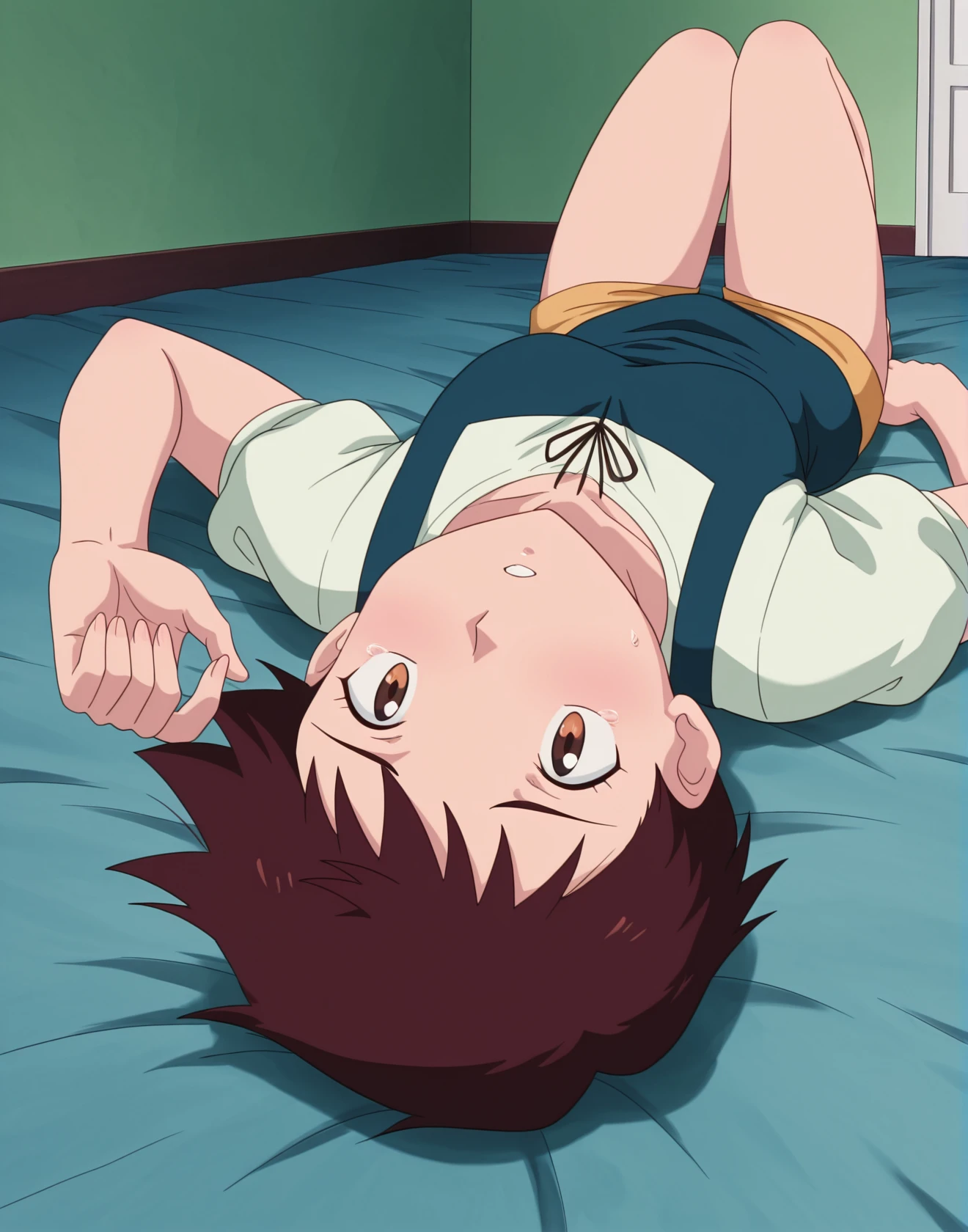 pkmArielle, short hair, brown hair, short sleeves, yellow pants, brown eyes,