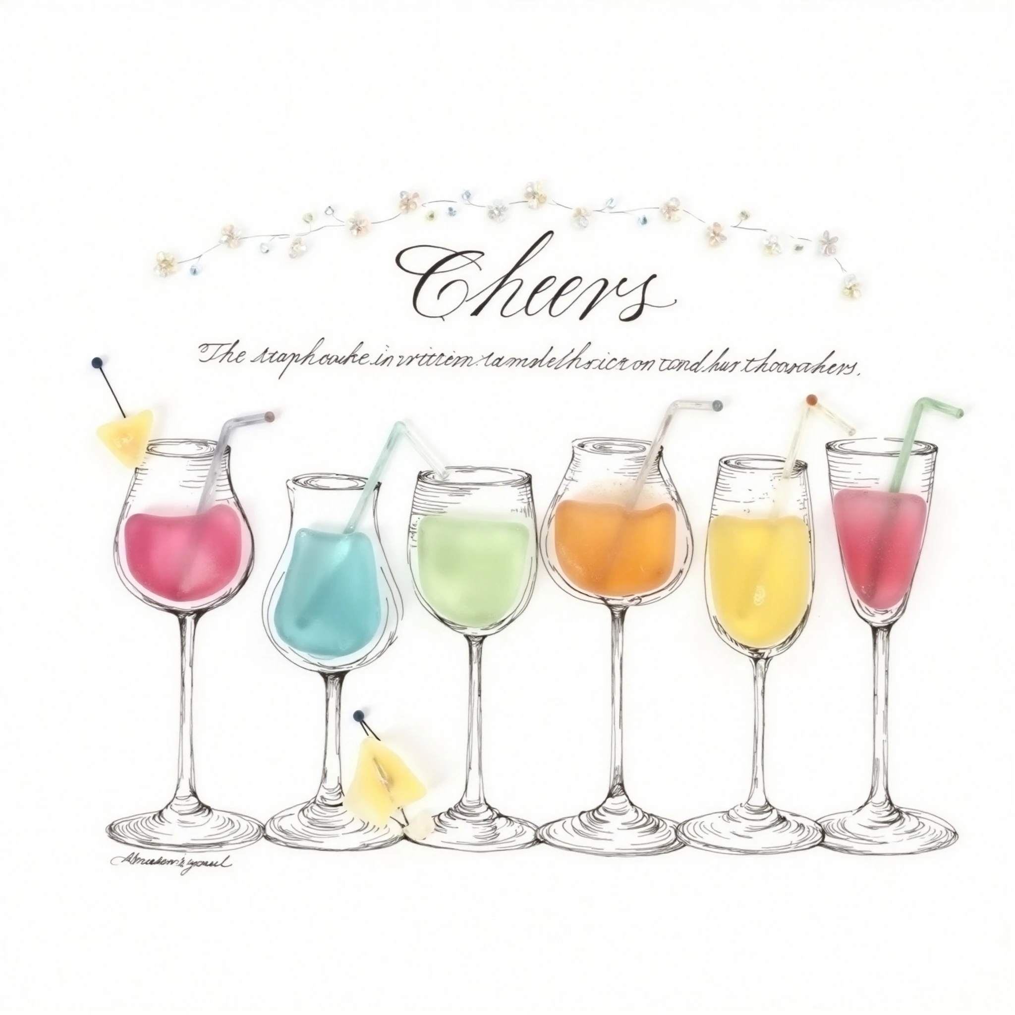 tag:6y25r style,best quality, A detailed illustration of a row of wine glasses filled with various colored liquids, possibly cocktails, set against a textured white background. The glasses are intricately drawn with a variety of colors, including pink, blue, green, yellow, and orange. Each glass is filled with a different liquid, and some have a straw sticking out of it. Above the glasses, there is a handwritten text that reads, 'Cheers,' in a cursive, elegant script. The text is surrounded by a decorative border with small, sparkling embellishments. The overall style of the image is whimsical and celebratory, with a touch of whimsy.