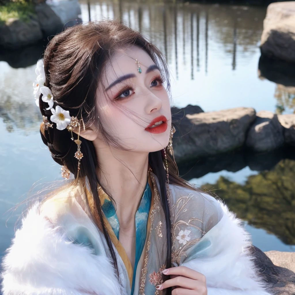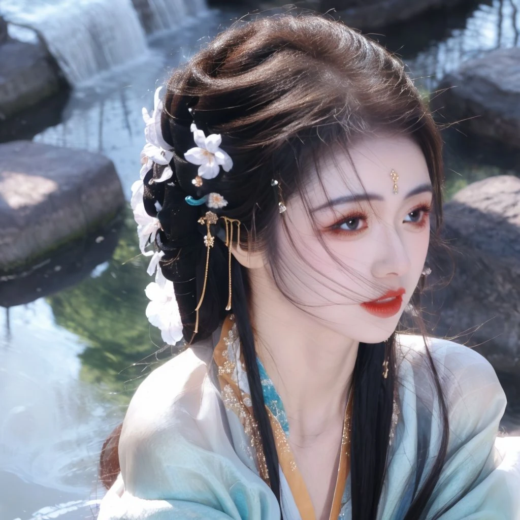 ultra-detailed texture rendering,realistic lighting and shadow,highest image quality,classical Chinese art aesthetic,Focus, serene forest background, serene water features, soft natural light, shadows on trees,East Asian young woman,traditional Chinese dress,long dark hair, with ornate hair accessories,paper umbrella and fan,harmonious color palette with soft pastels,intricate pattern detailing on clothing,noble and elegantposture,peacefulexpression,