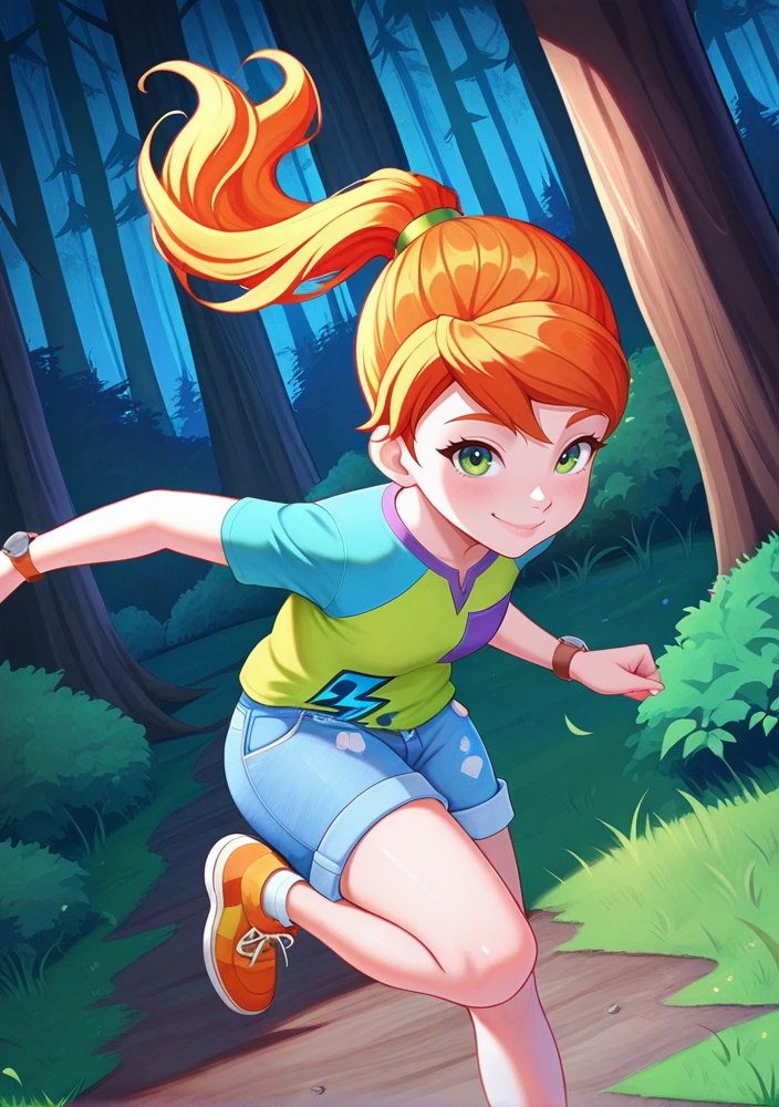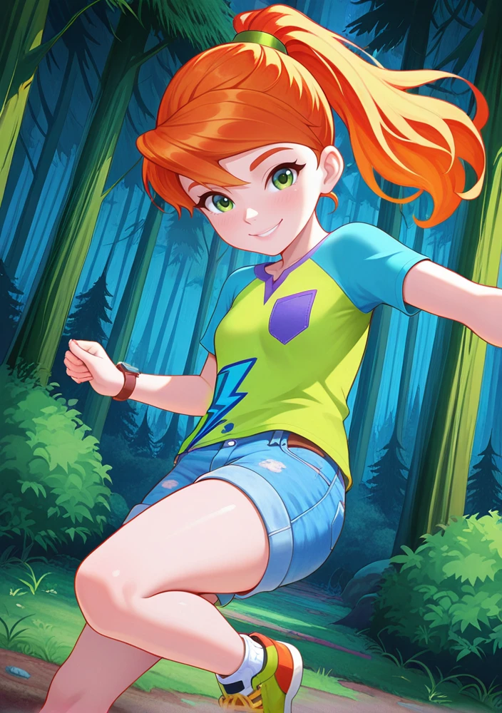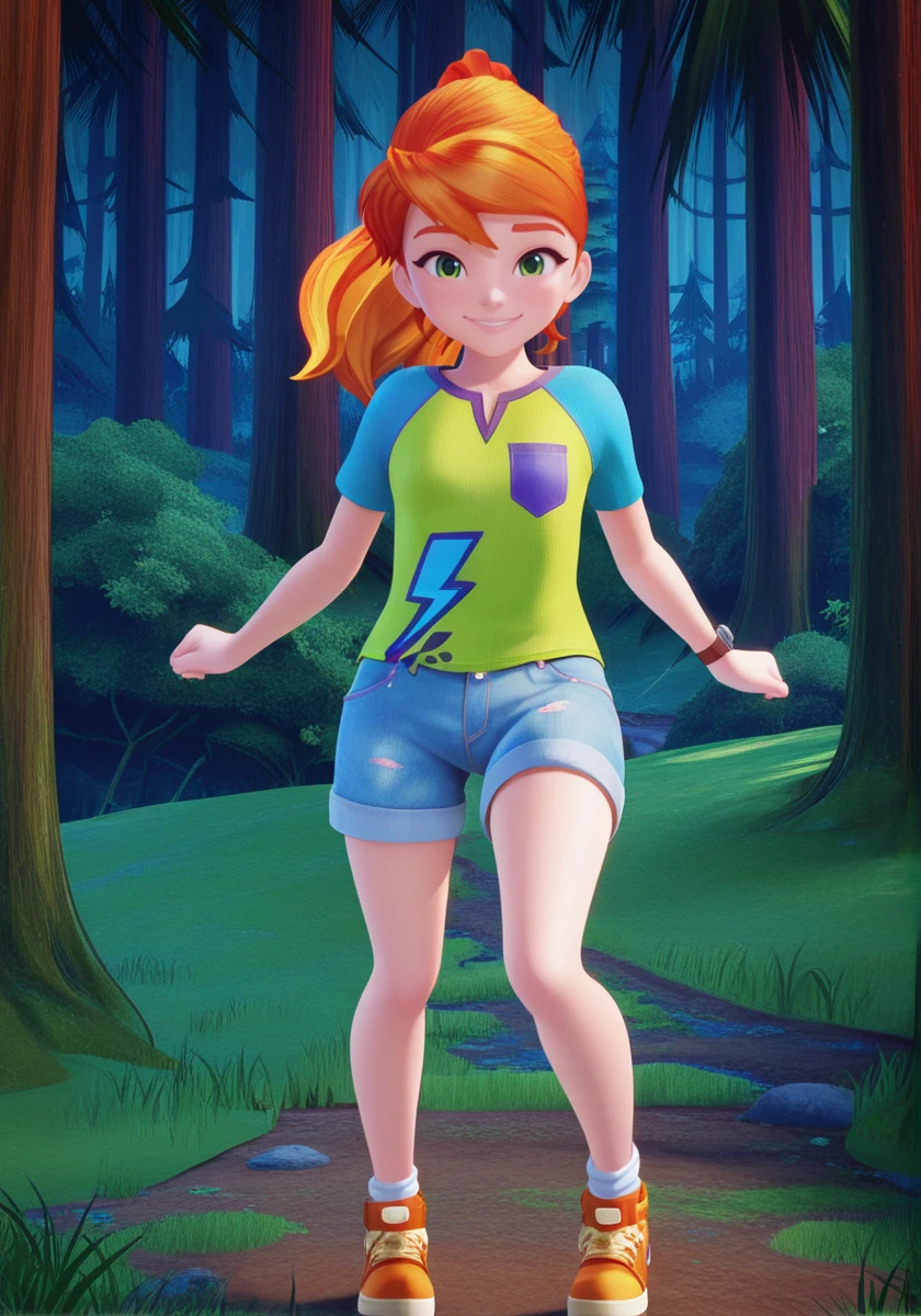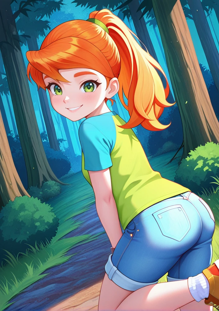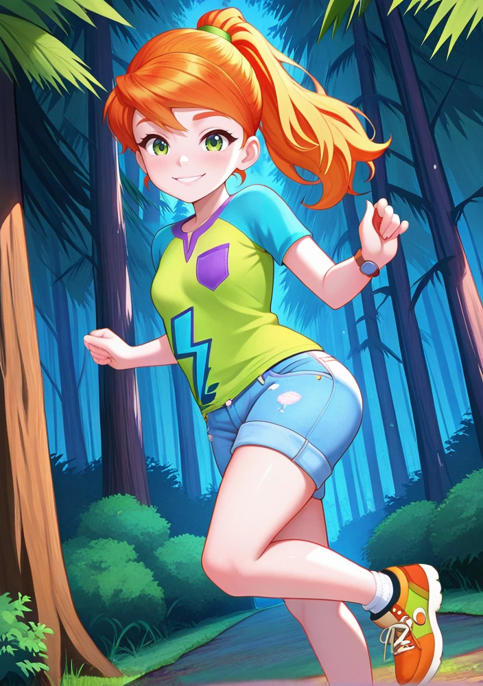 mia_illus, green eyes, orange hair, ponytail, long hair, shirt, raglan sleeves, green shirt, shorts, denim, shoes, socks, watc,