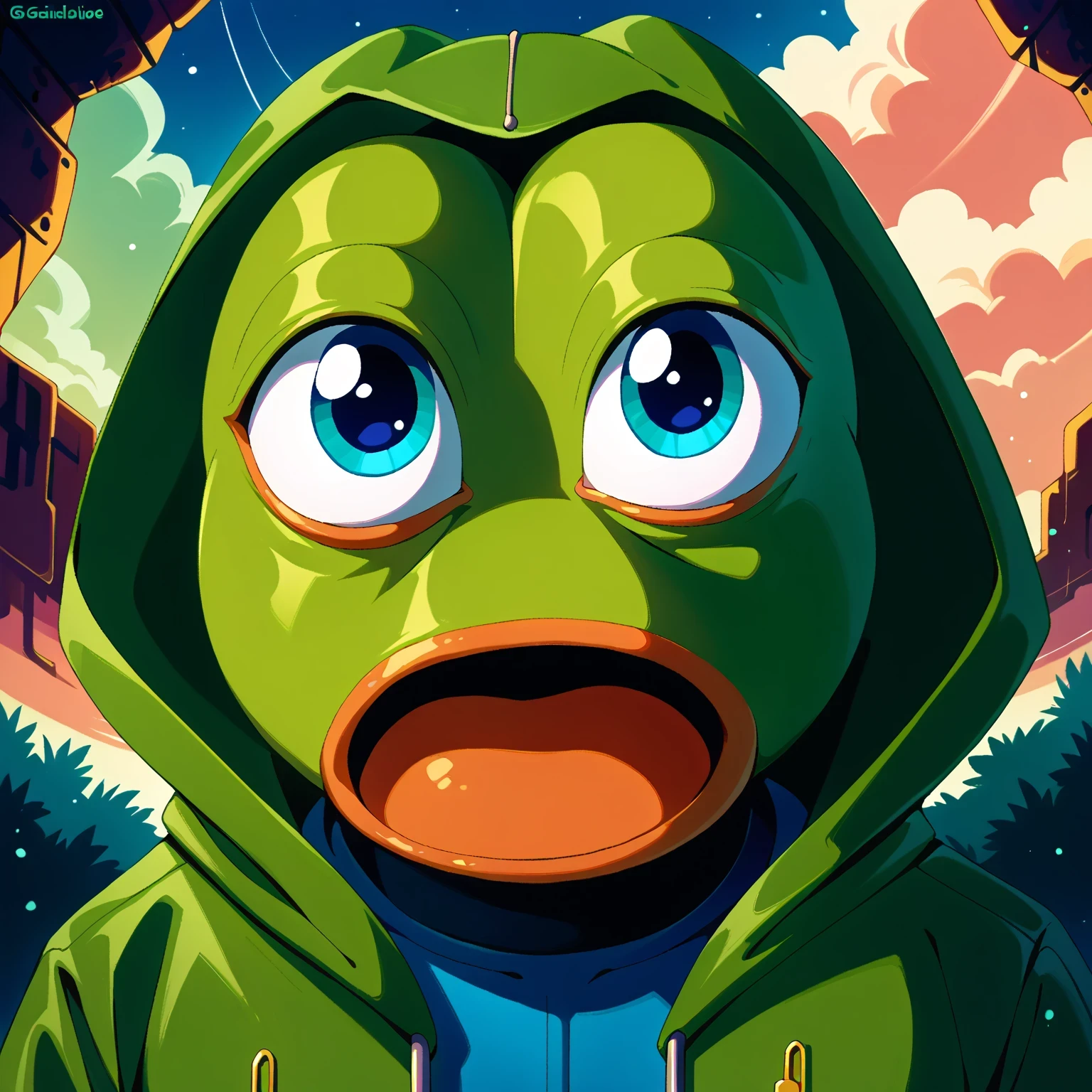 Create dope anime art of Pepe.