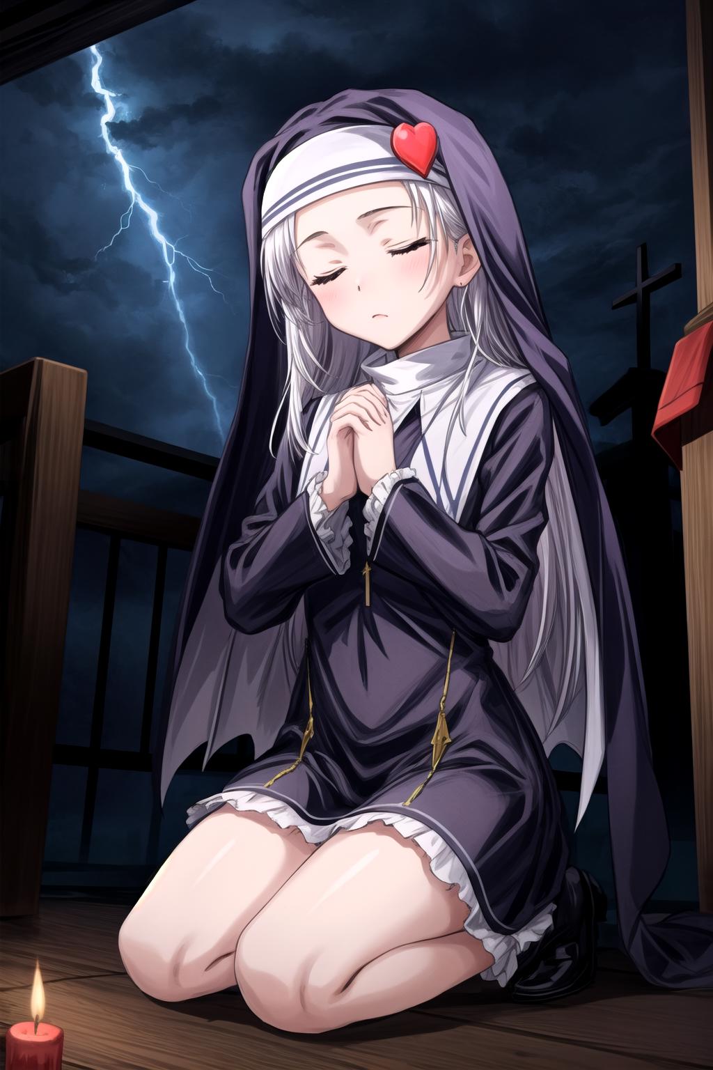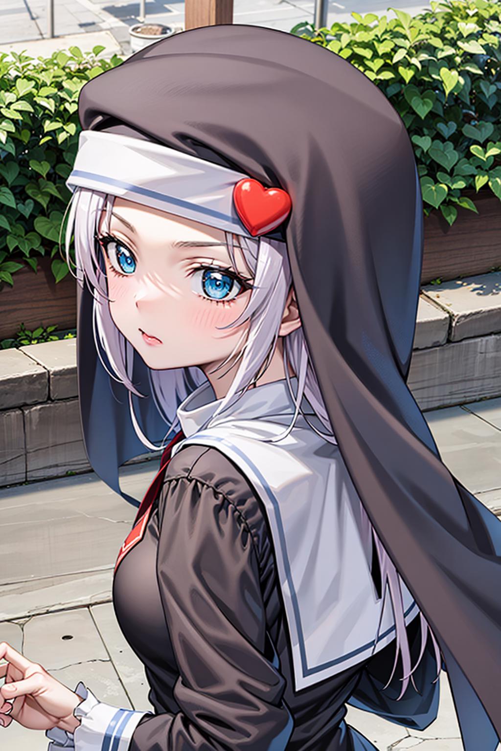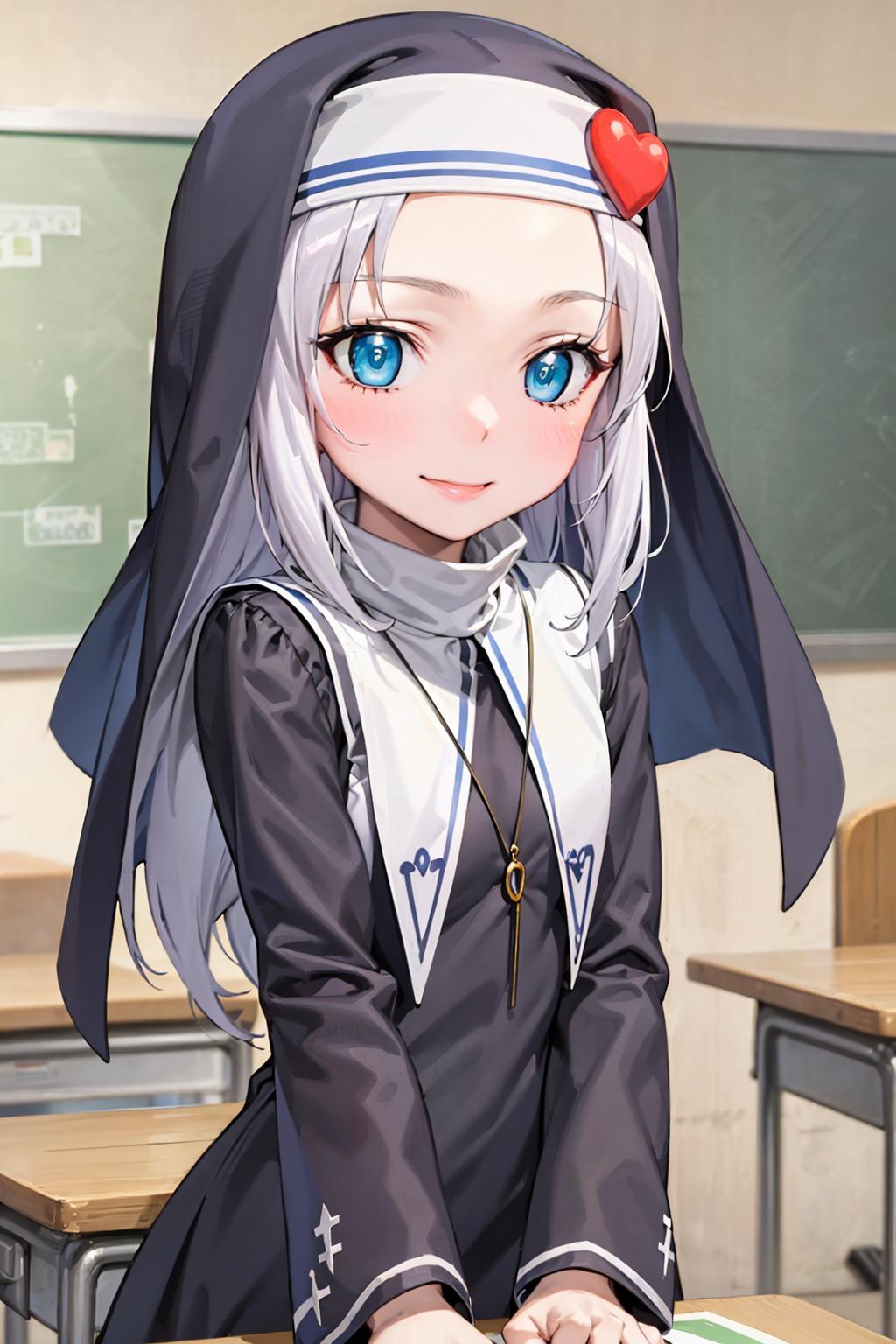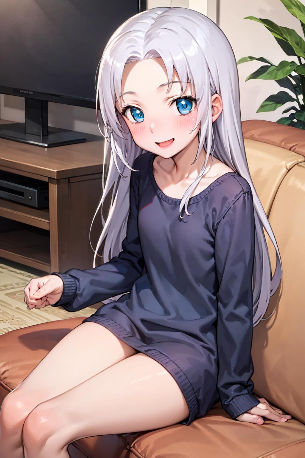 Character: takayama maria, silver hair, flat chest, blue eyes, long hair