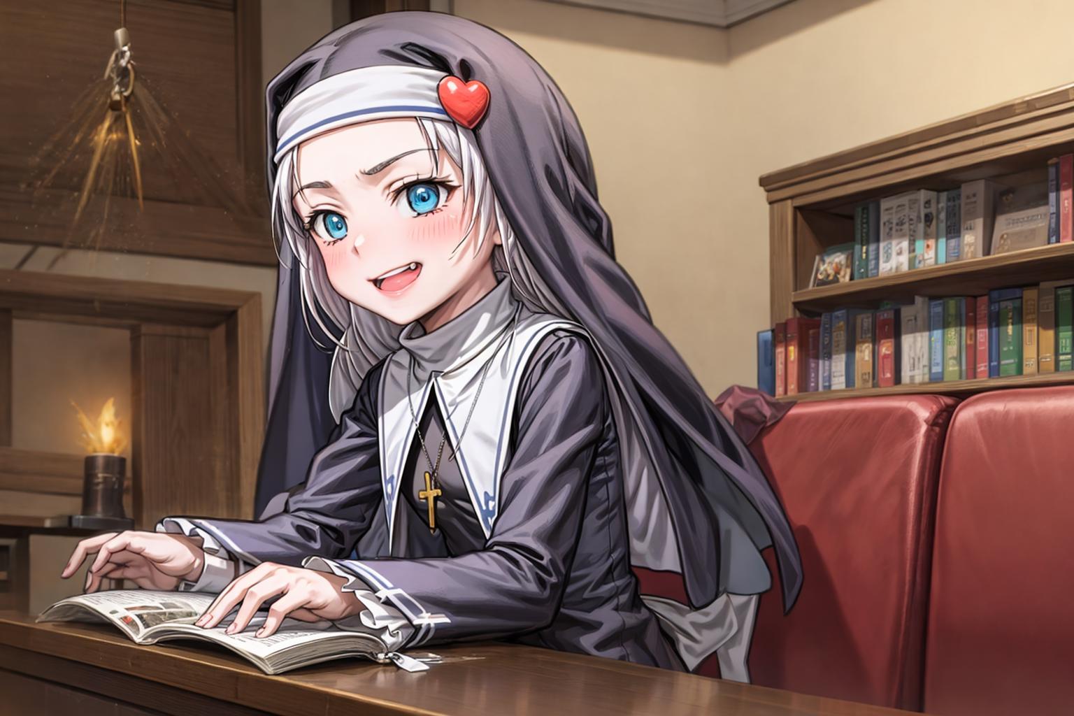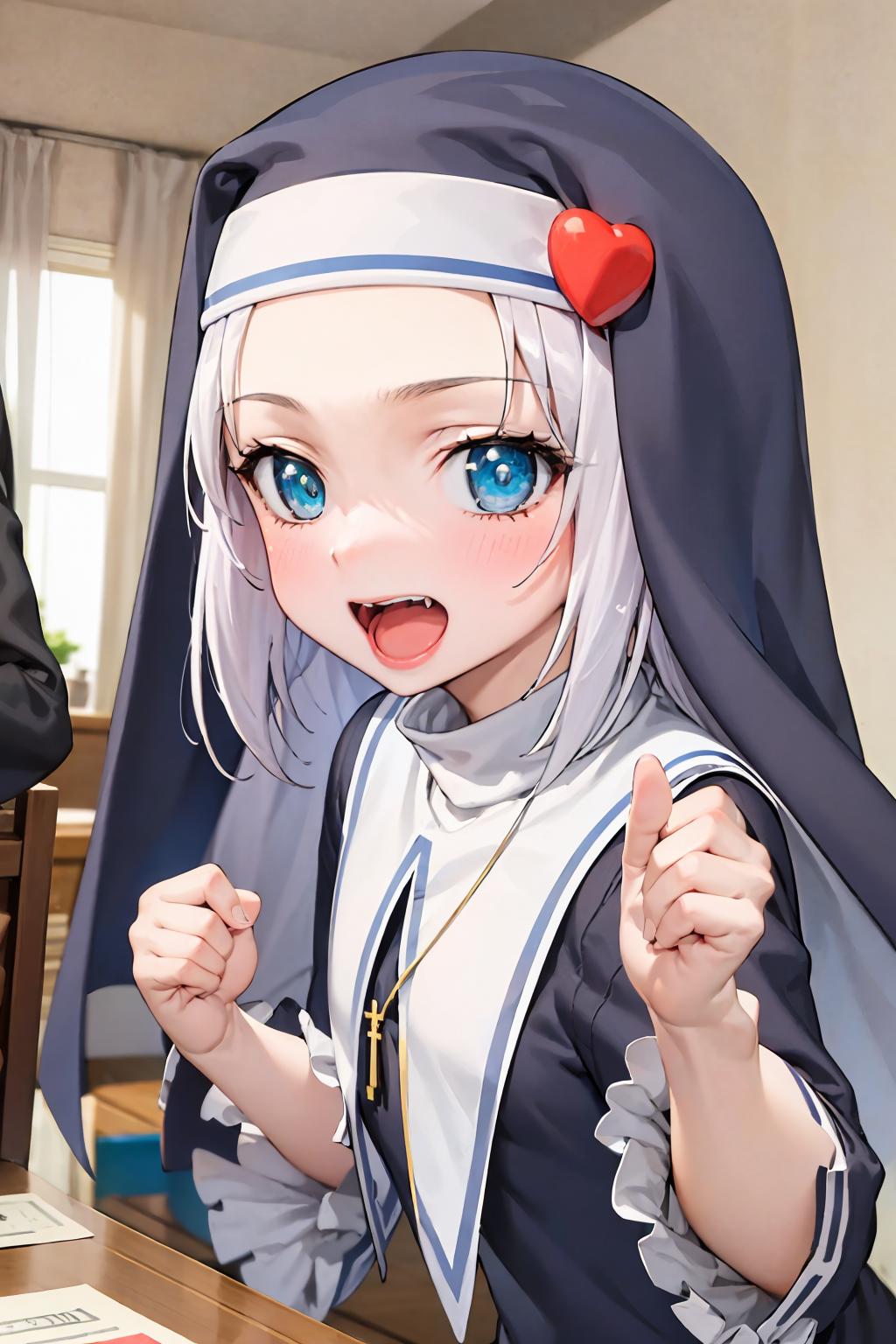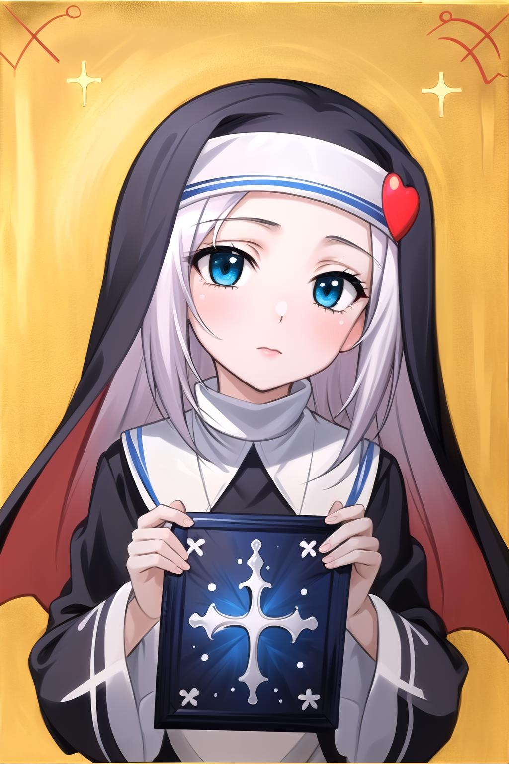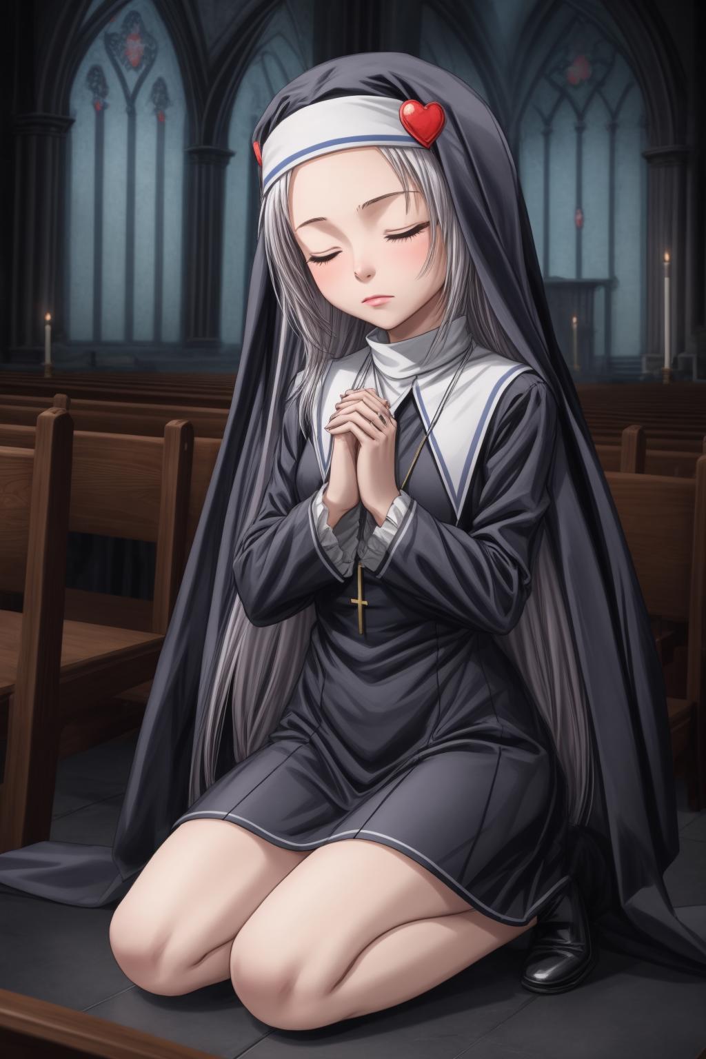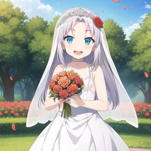 Character: takayama maria, silver hair, flat chest, blue eyes, long hair