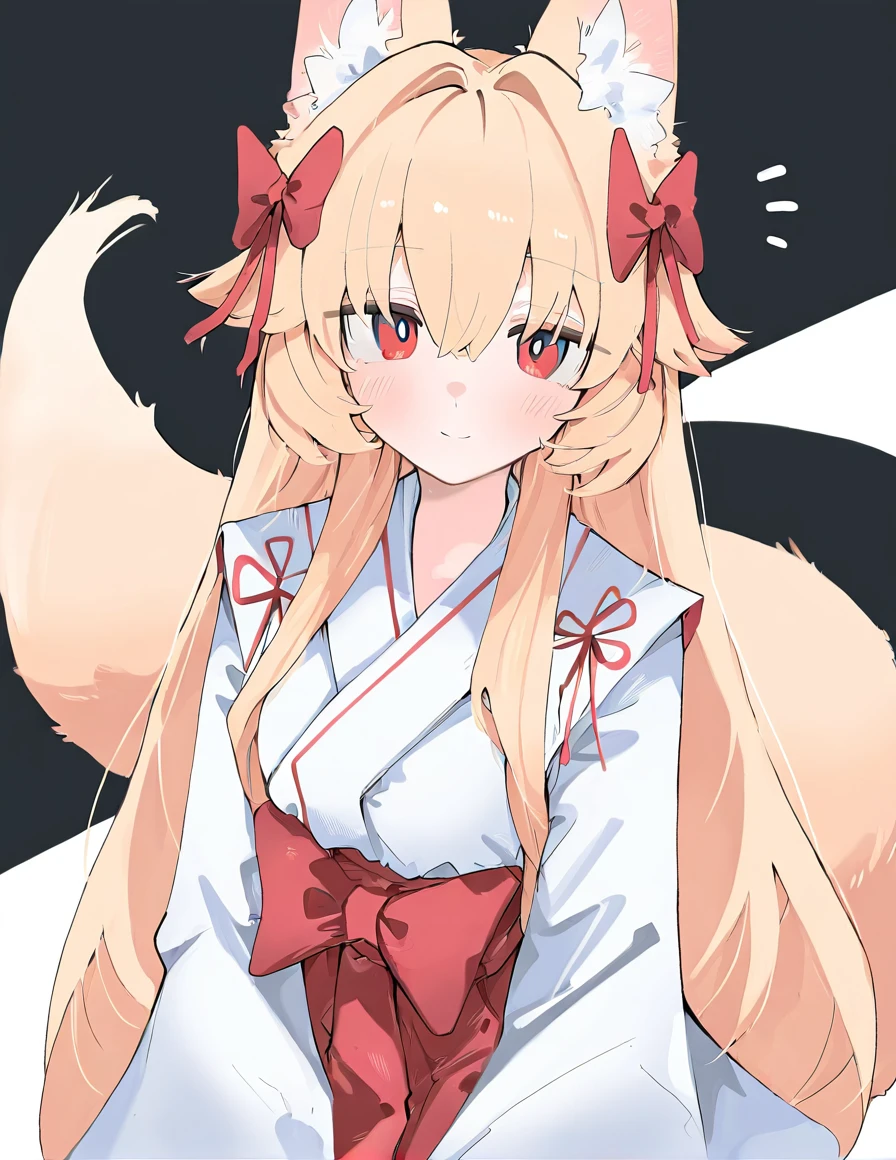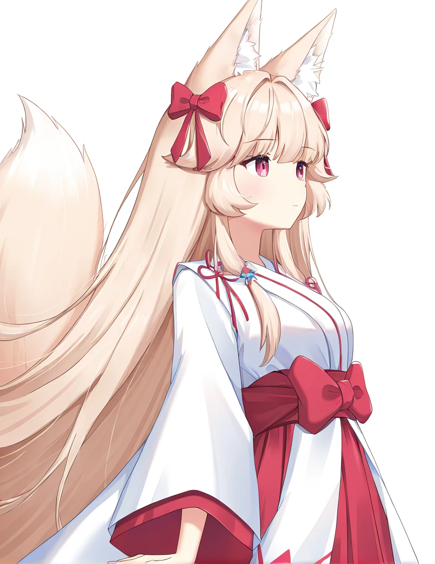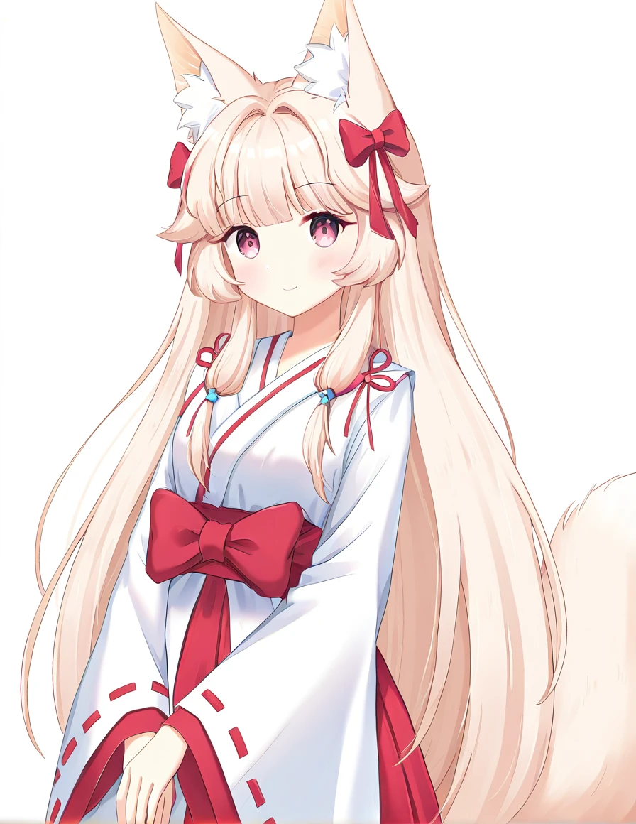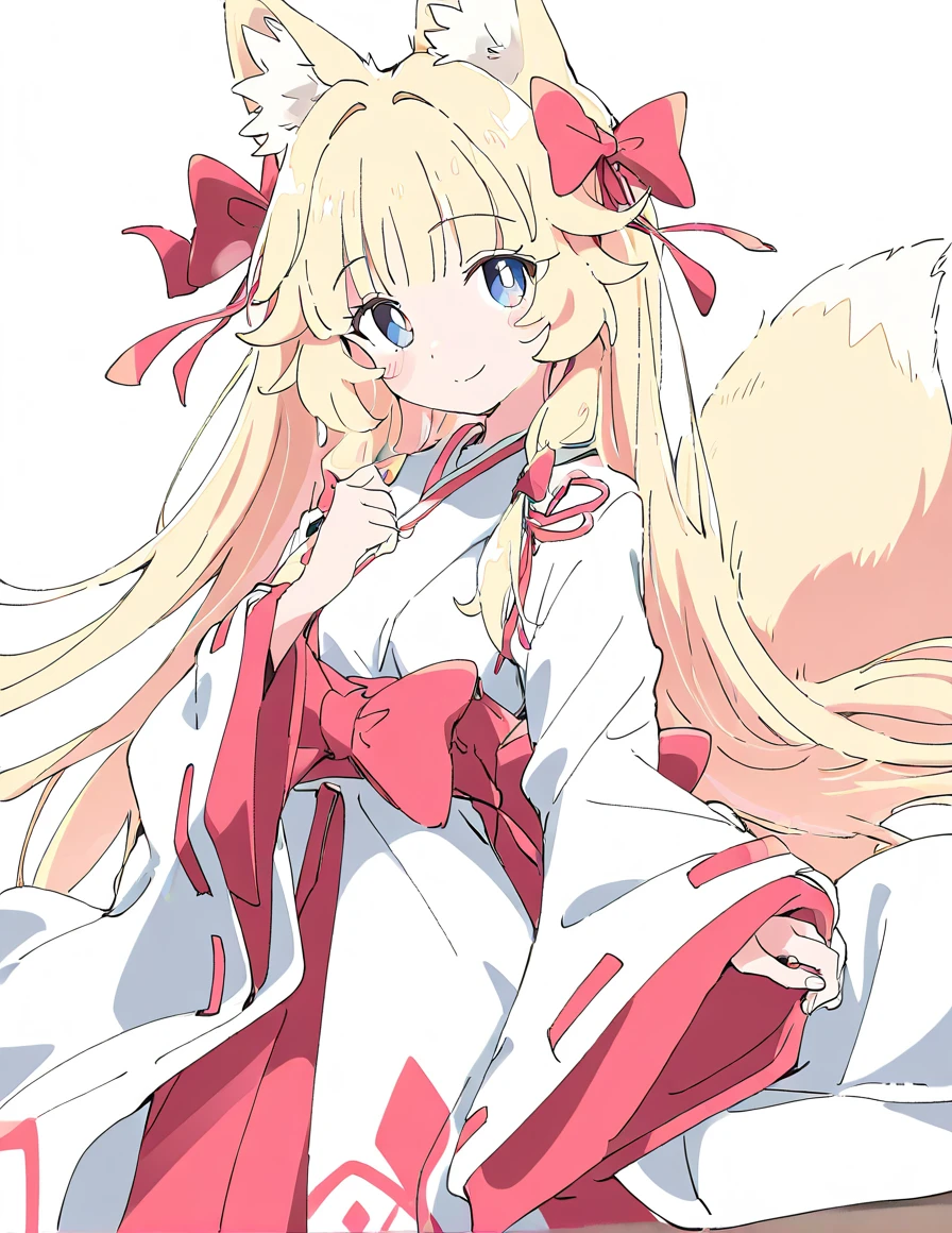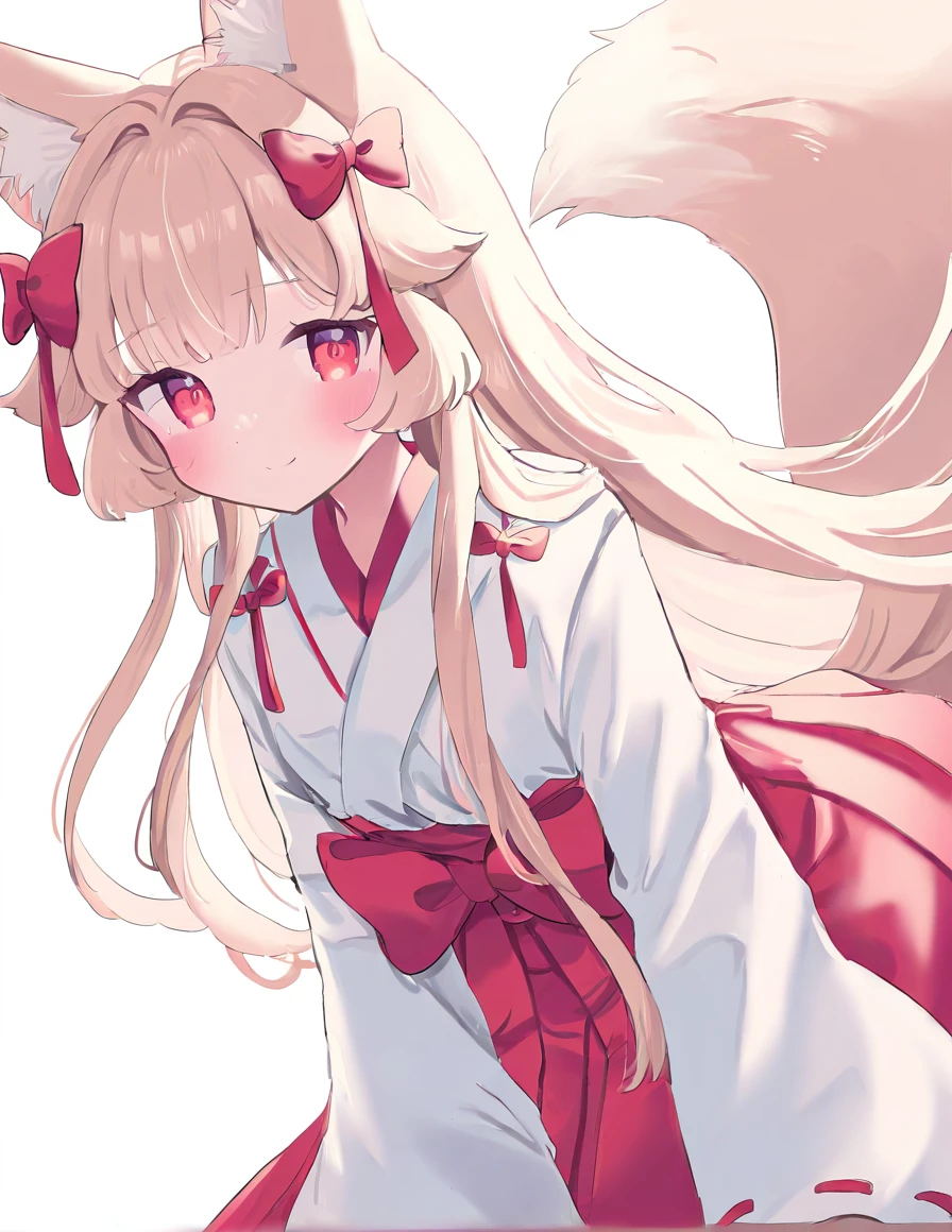 long sleeves,hair bow,white kimono,fox tail,hakama skirt,wide sleeves,