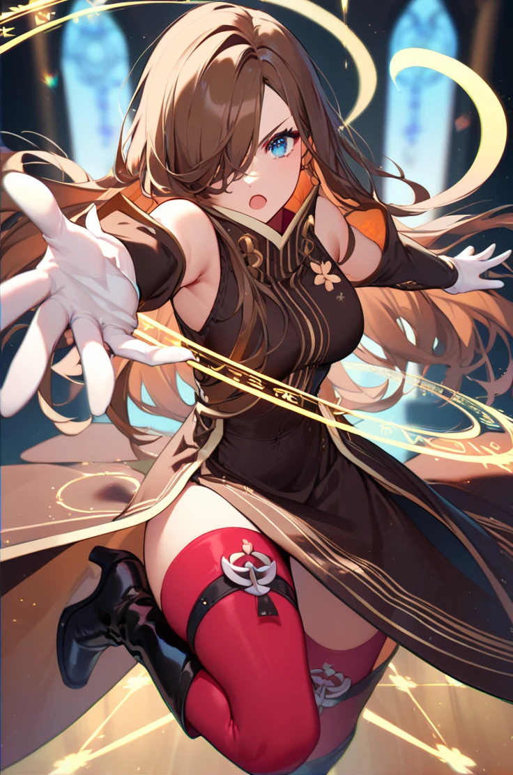 tearBase, brown hair, long hair, sidelocks, blue eyes, hair over one eye, sleeveless black brown dress, brown detached sleeves, white gloves, red thighhighs, black boots with high heels, high collar