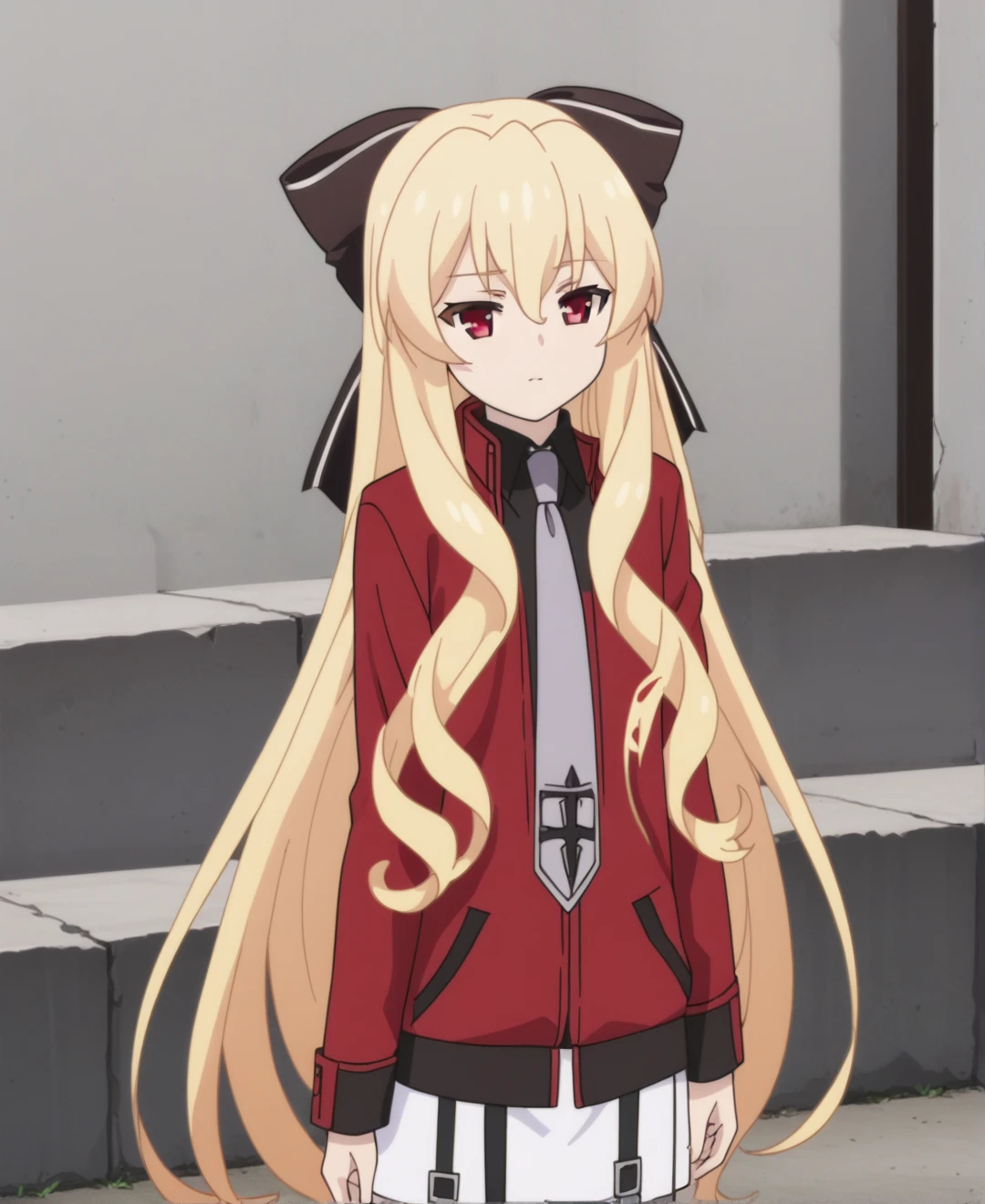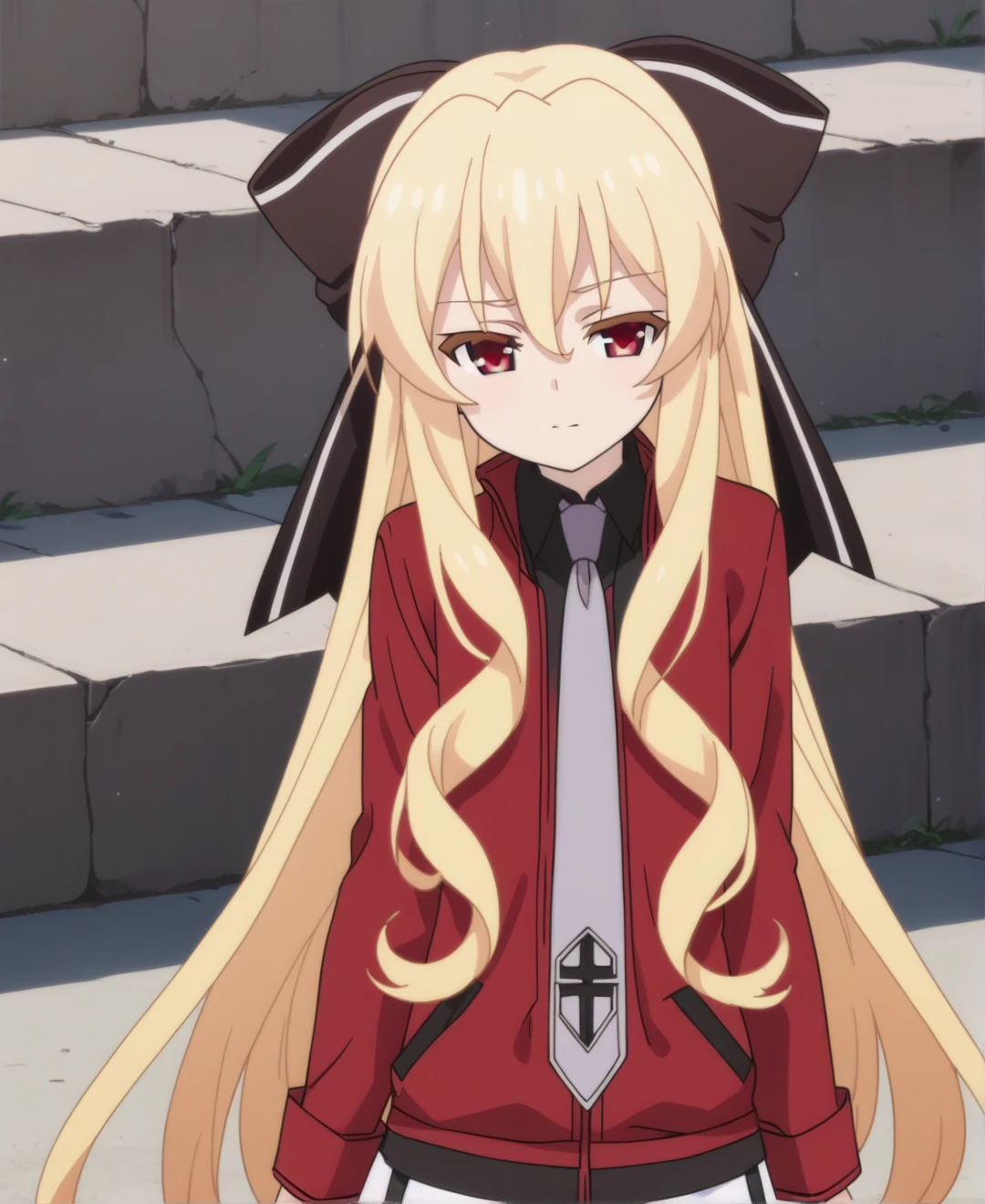 Leticia Draculair, blonde hair, long hair, red eyes, 1girl, bow, solo, very long hair, hair bow, black bow,