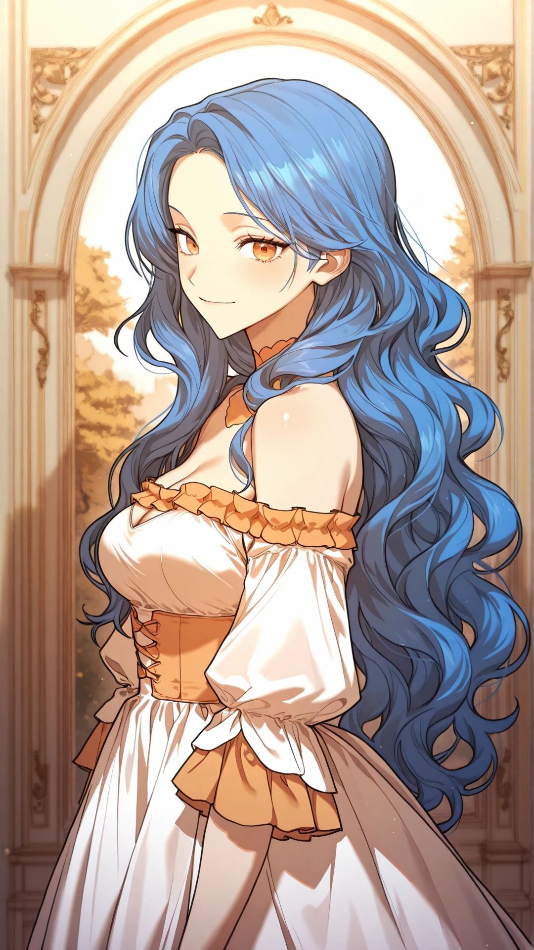 Aparience: 1girl, long hair, blue hair, wavy hair, orange eyes, breasts, medium breasts,