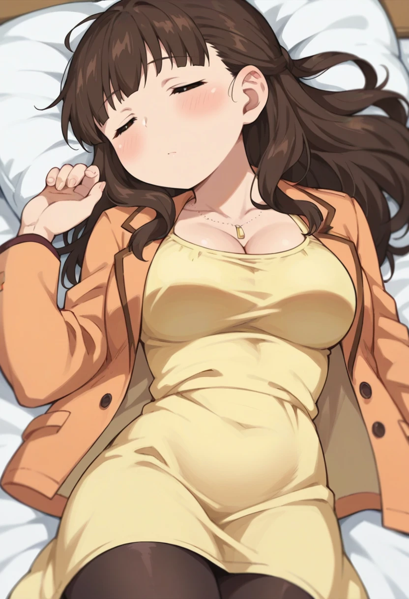 yellow dress, jewelry, light orange jacket, dark pantyhose,