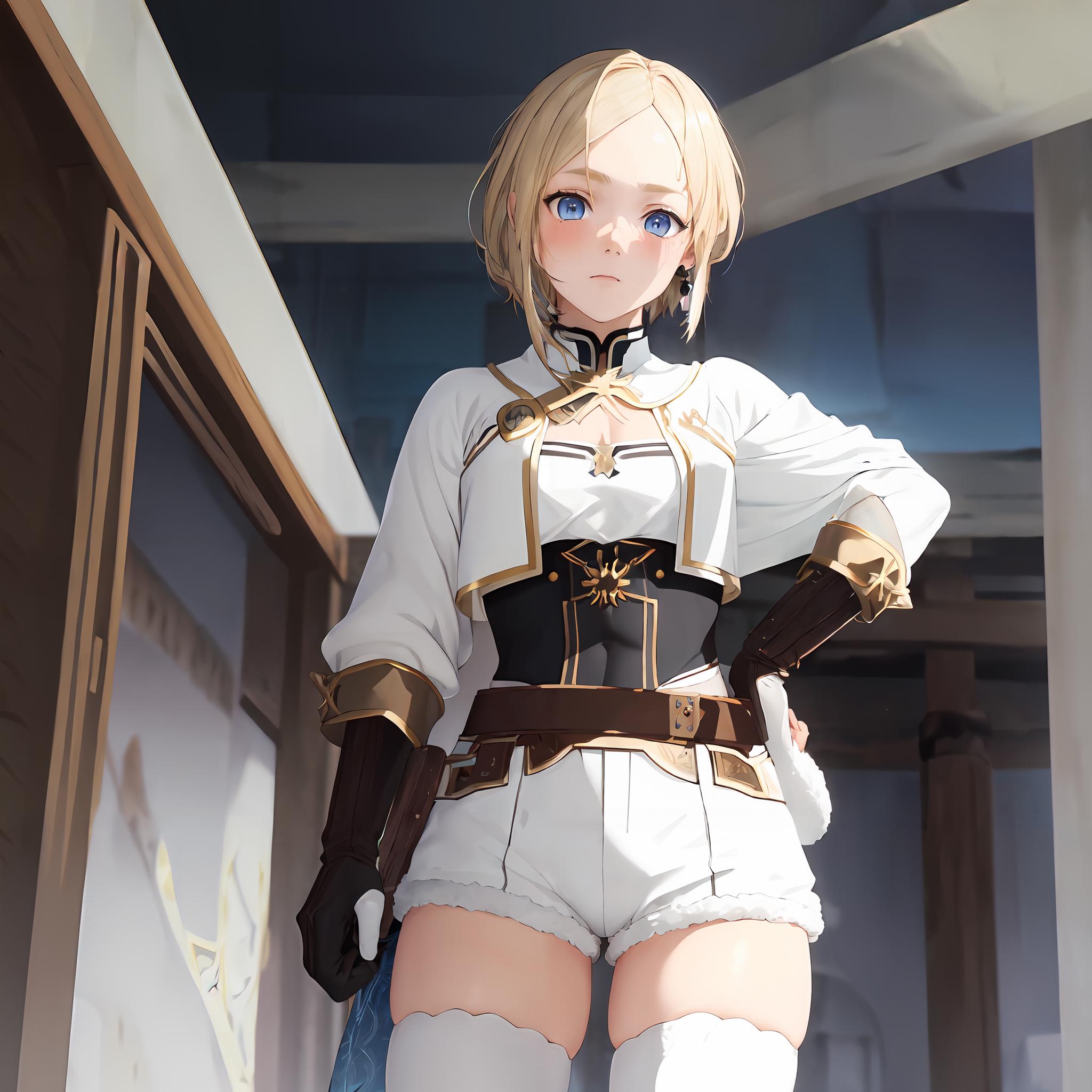 recommended tags: blonde_hair, blue_eyes, white_capelet, black_shorts, white_thighhighs, fur_trim, belt, brown_glove, single_glove, feather_earing, leotard_under_clothes