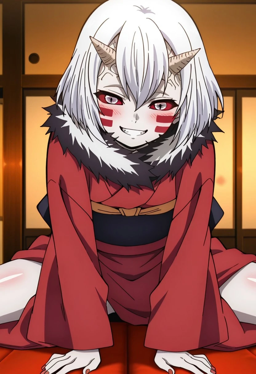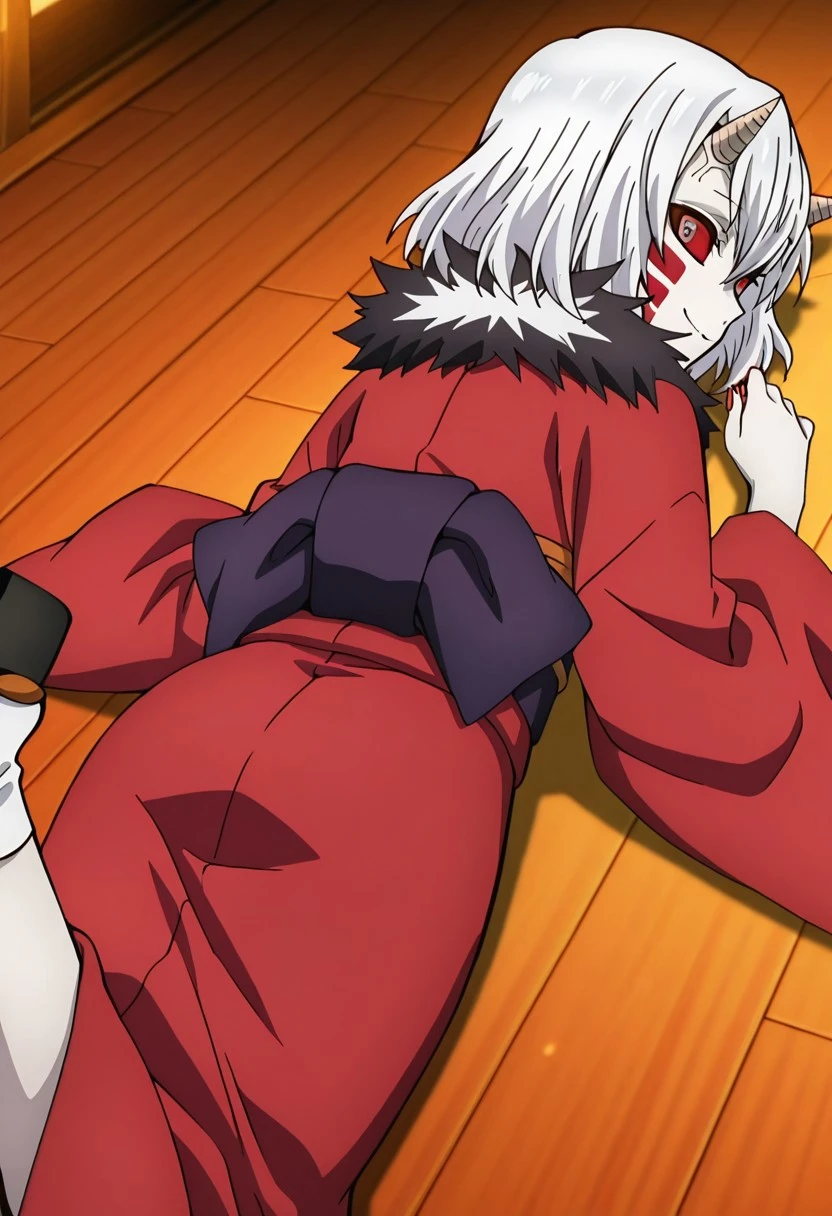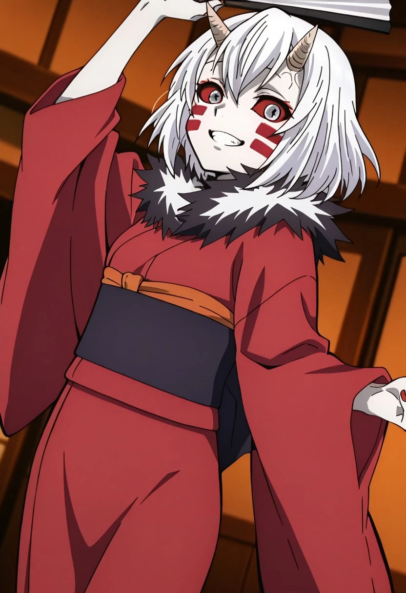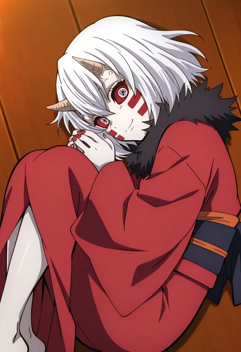 mukago, 1girl, horns, oni, oni girl, red eyes, red sclera, short hair, white hair, hair between eyes, tattoo, facial tattoo, pale skin, shiny, shiny skin, facial mark