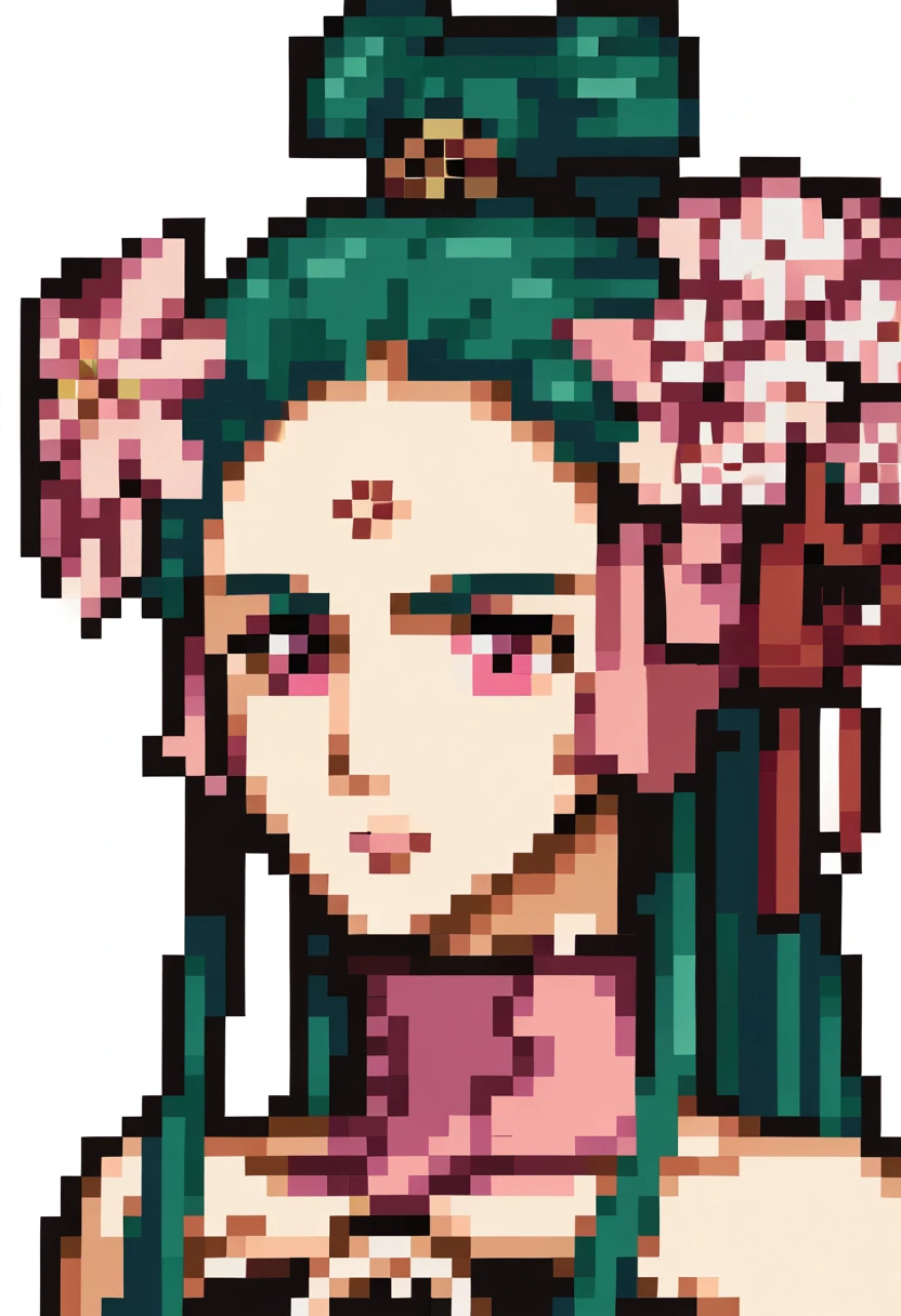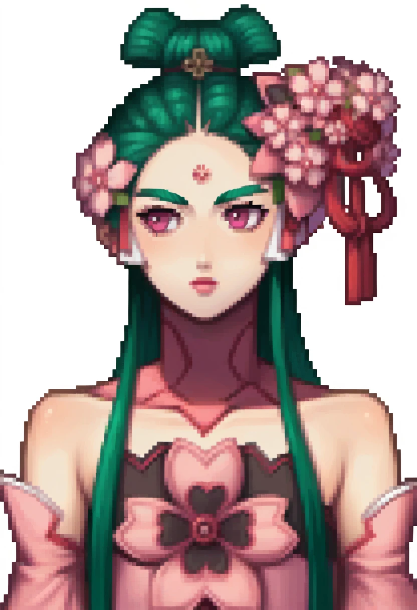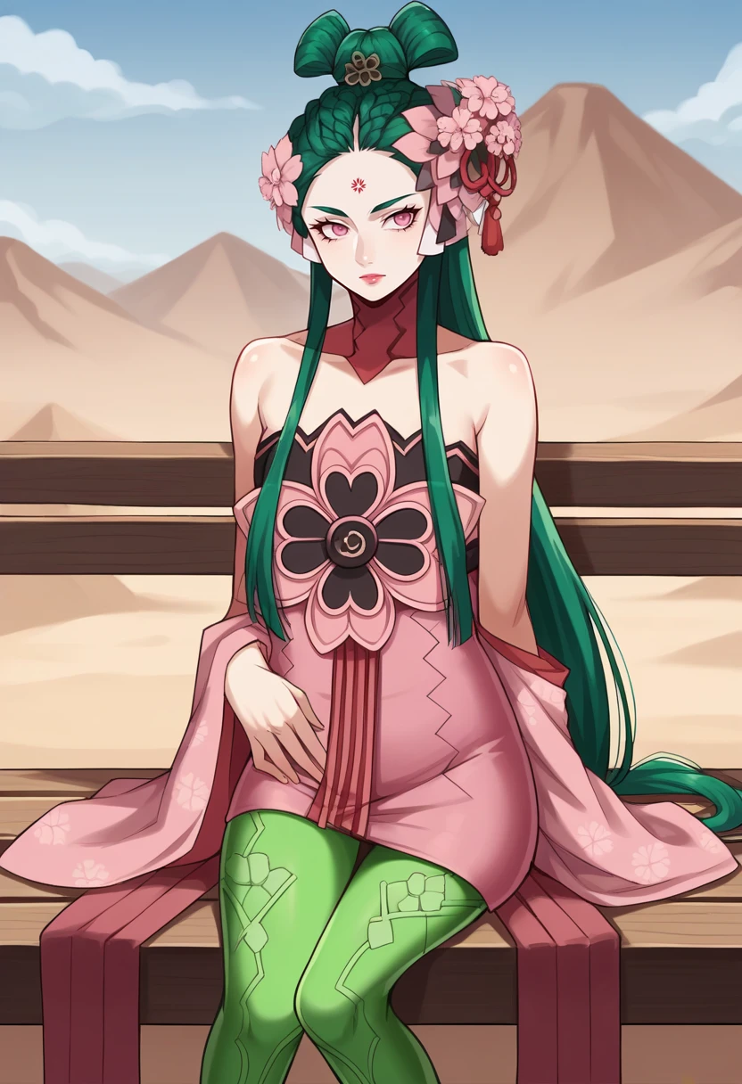 tags: konohanasakuyasmt, green hair, very long hair, pink eyes, lipstick, hair flower, forehead mark, choker, pink dress, japanese clothes, detached sleeves, green pantyhose
