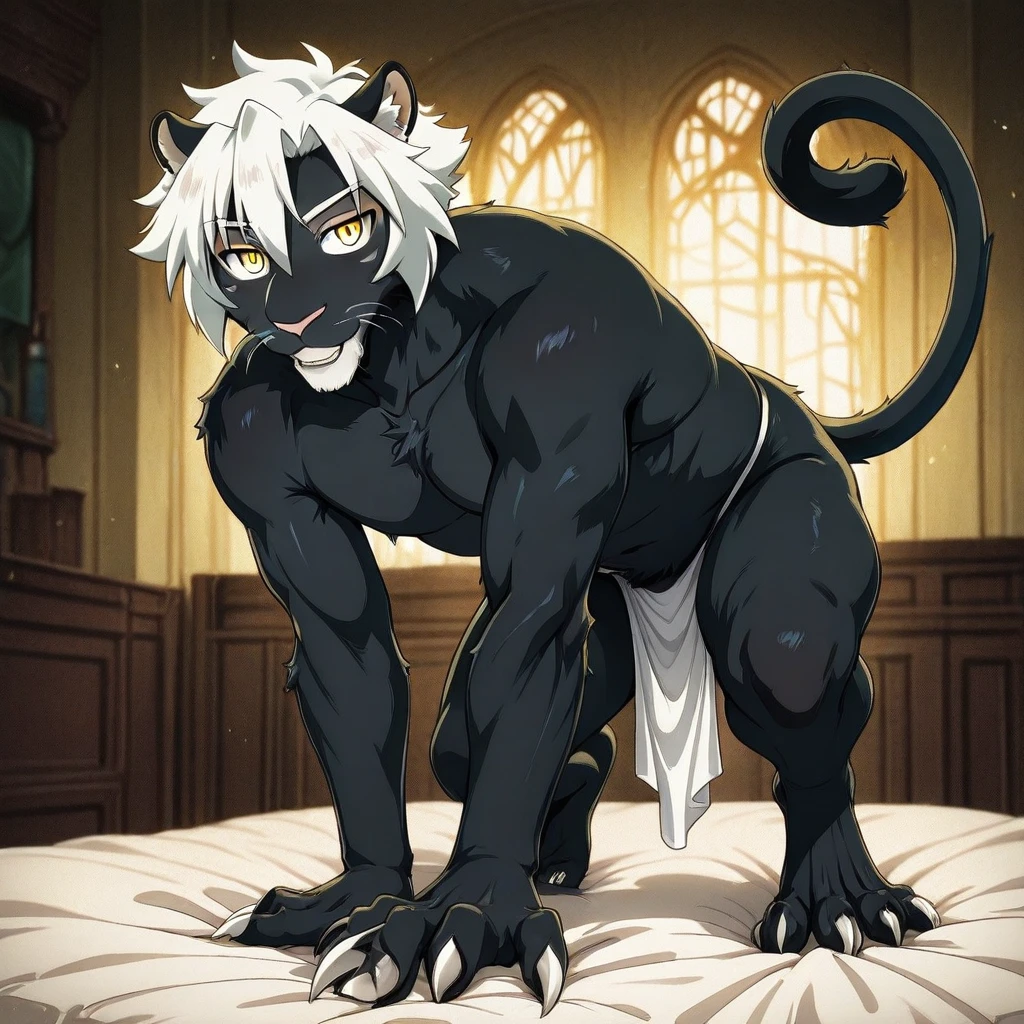 1boy,solo, white messy short hair, layered, side bangs,mature male, male, twink, anthro, panther, animal ears, yellow eyes, 2 yellow eyes, white hair, black fur, black body,