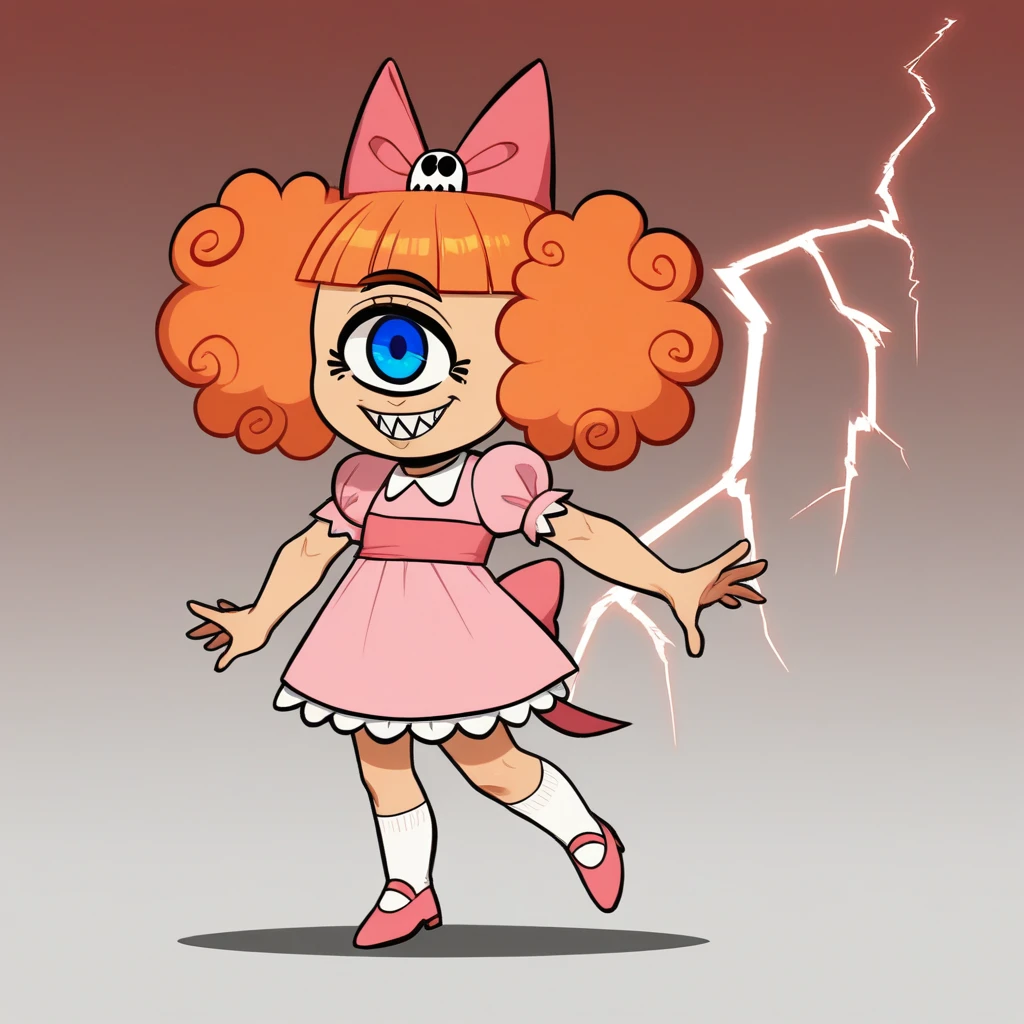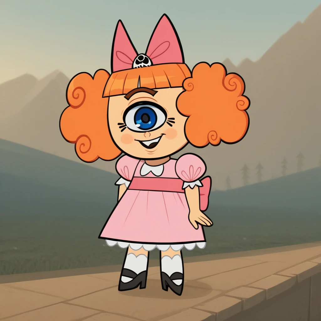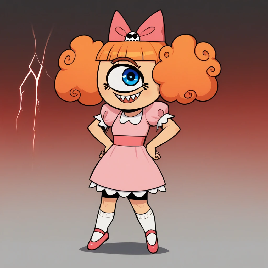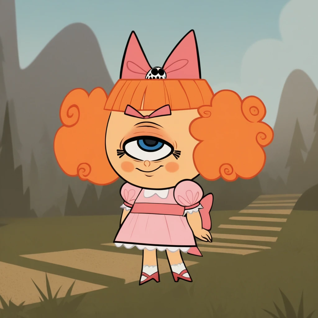 no humans, MeanJean, 1girl, solo, orange hair, unibrow, blue eye, one-eyed,