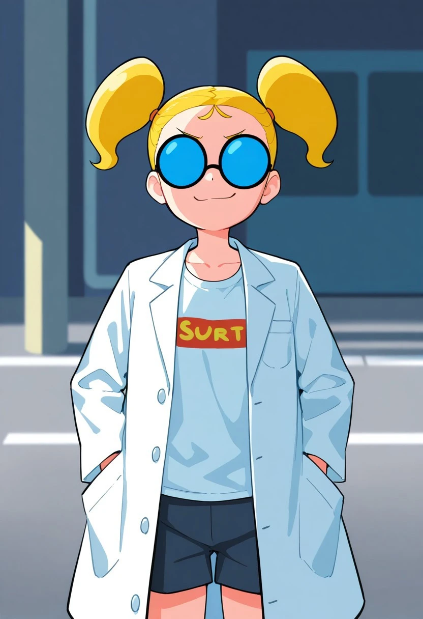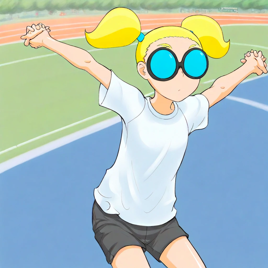 J_S_P_S, blonde hair, short twintails, opaque glasses, floating eyebrows,