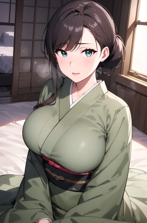 low_ponytail,brown eyes,brown hair, bangs,Hair_bun,