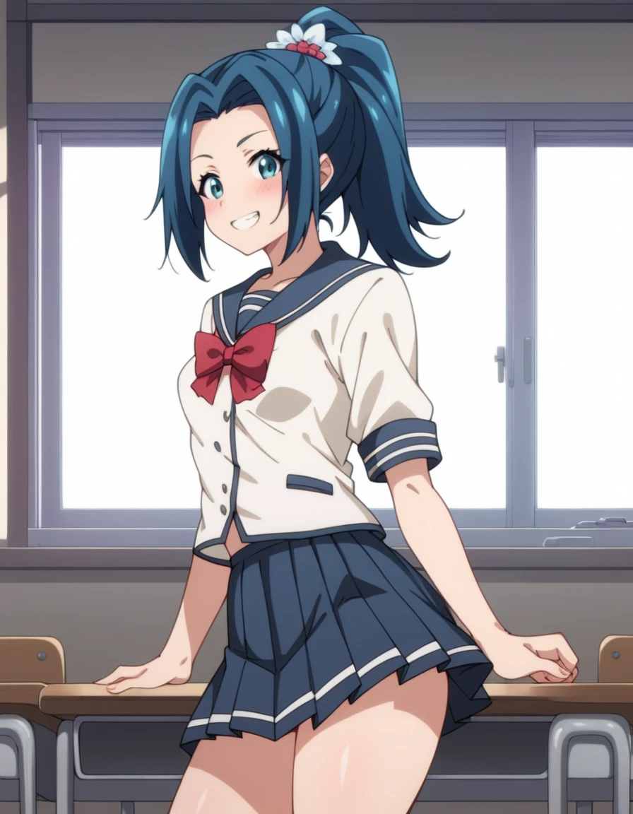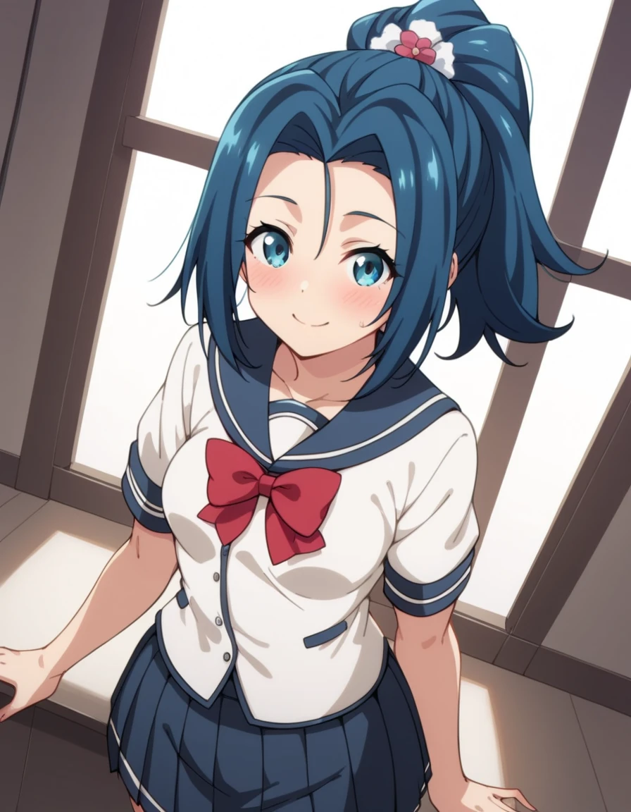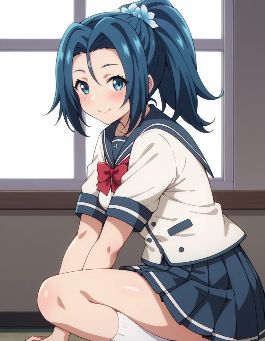 HinaHanetachi, blue eyes, blue hair, ponytail, hair ornament, hair flower, medium-small breasts,
