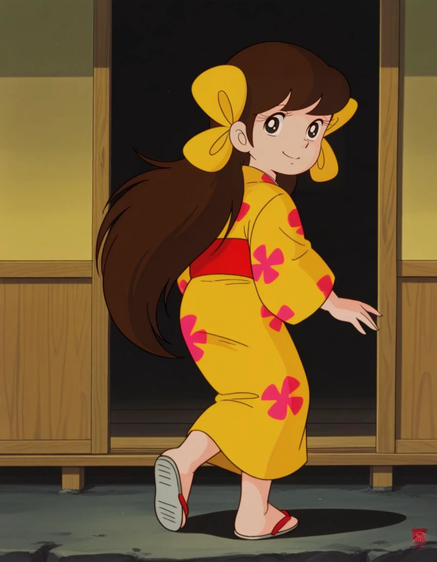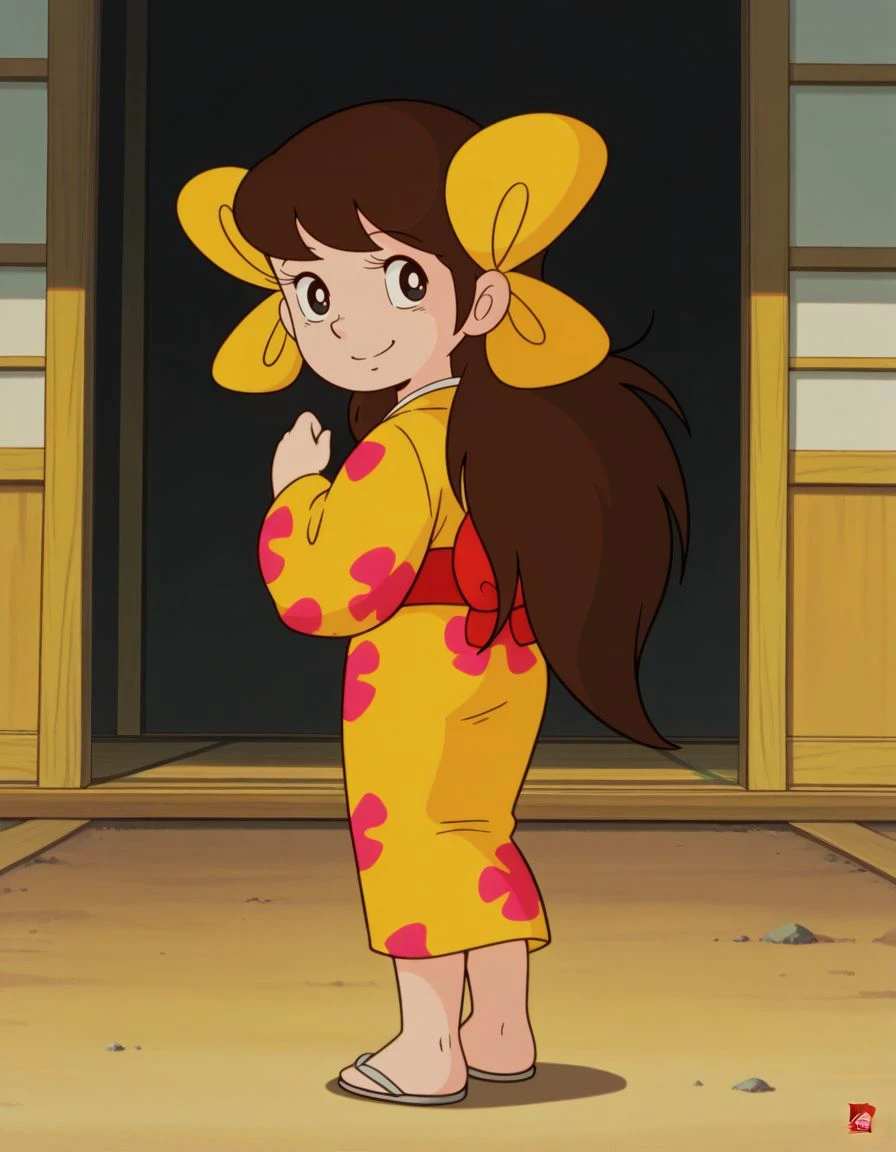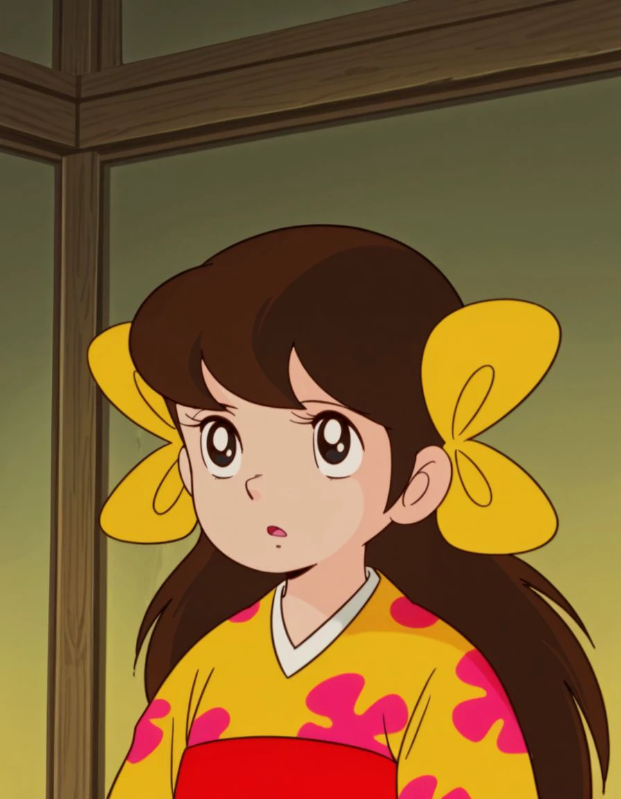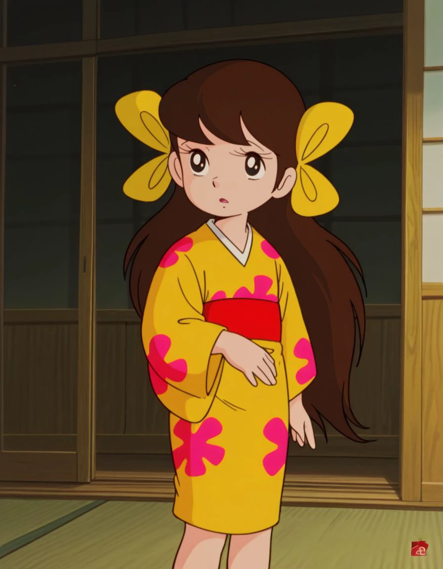 <lora:Sakura:1>, saku4a, long hair, brown hair, black eyes, yellow kimono, multiple hair bows, 1970s \(style\),