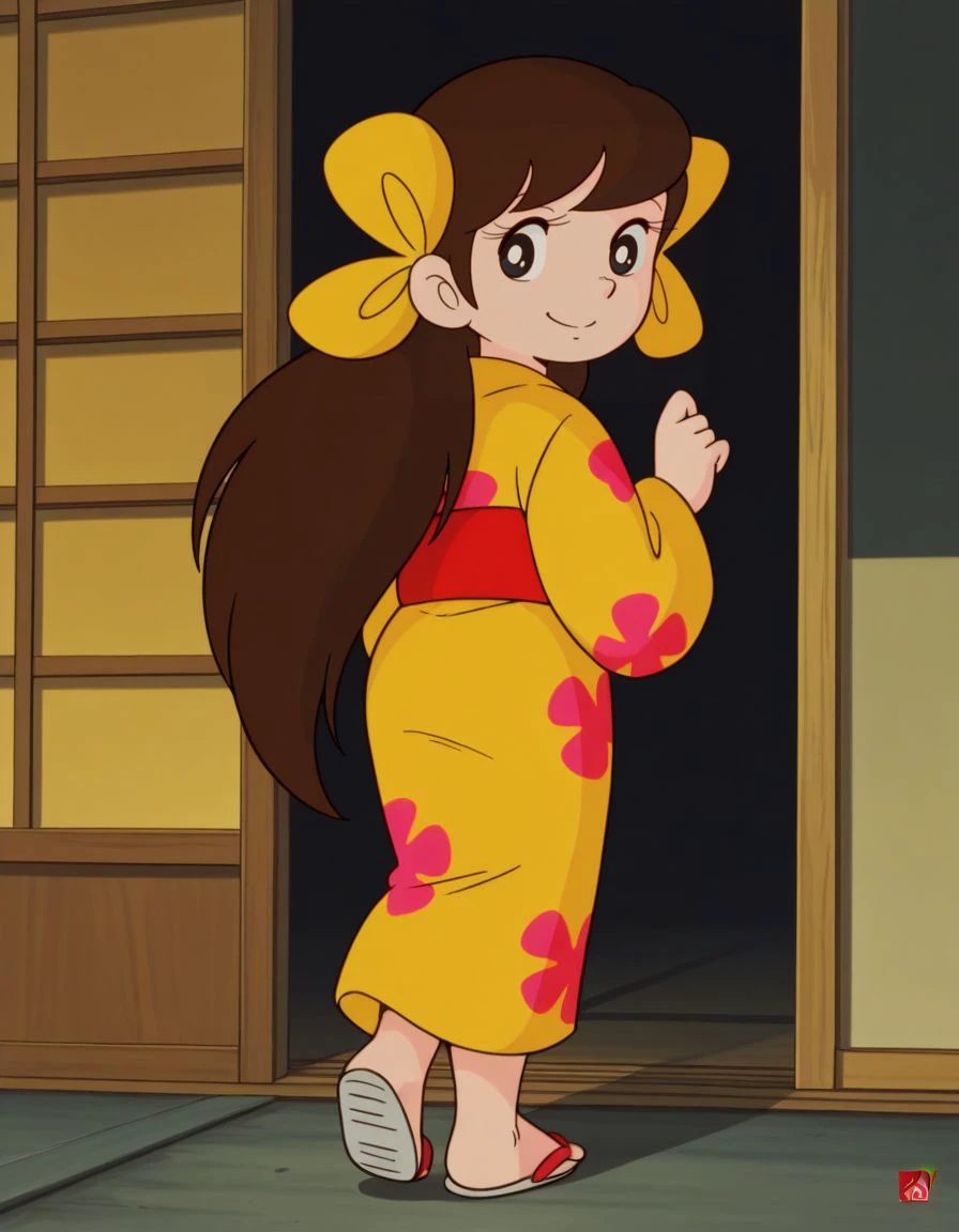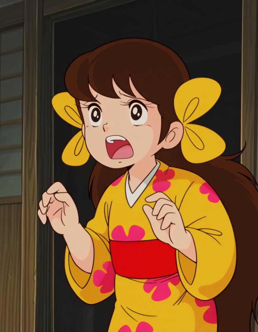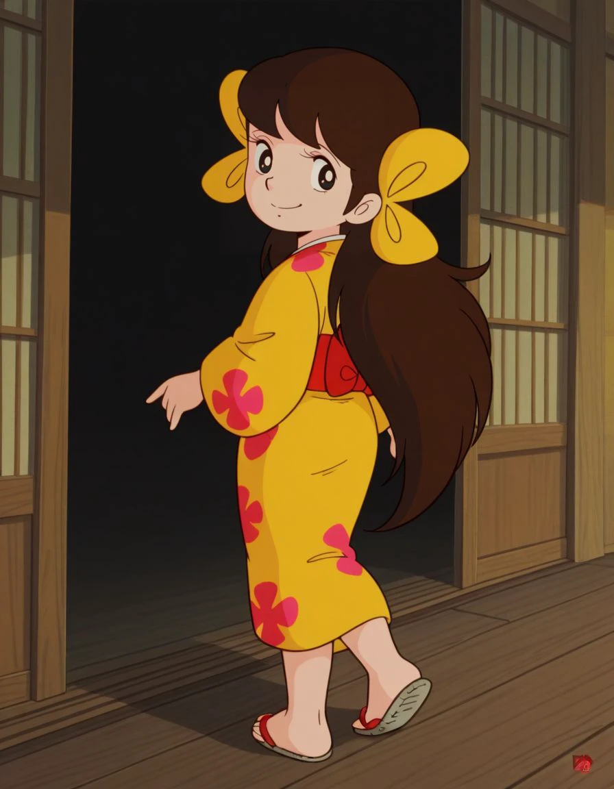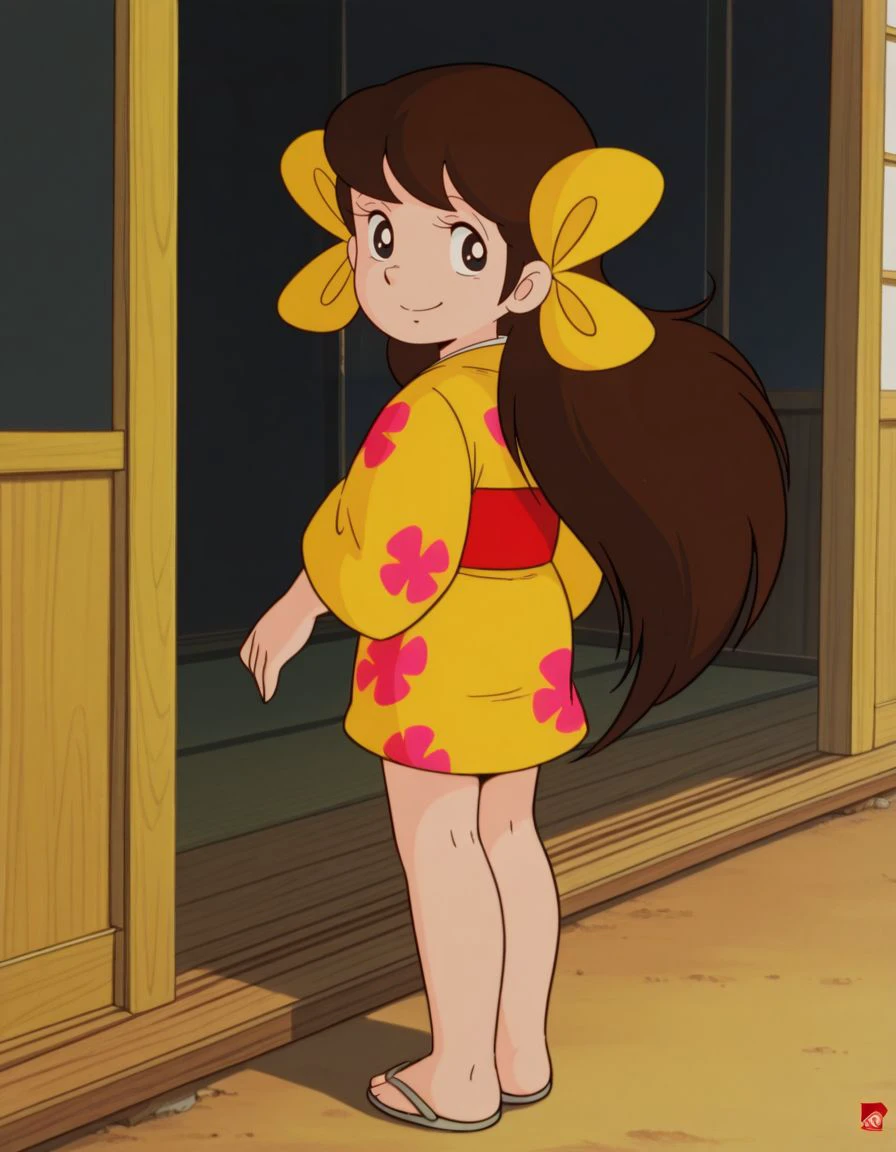 <lora:Sakura:1>, saku4a, long hair, brown hair, black eyes, yellow kimono, multiple hair bows, 1970s \(style\),