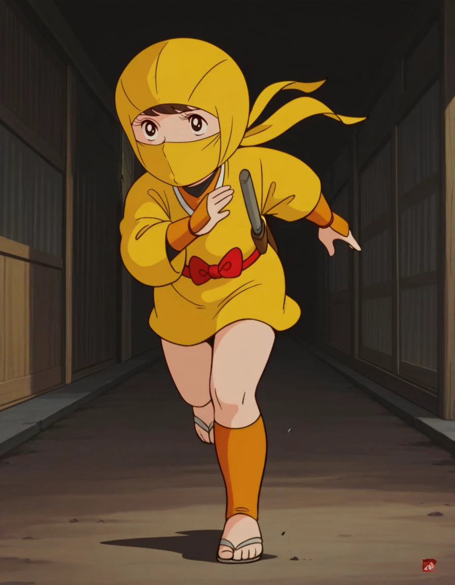 <lora:Sakura:1>, saku4a, black eyes, 1970s \(style\), (yellow ninja mask, ninja headwear),