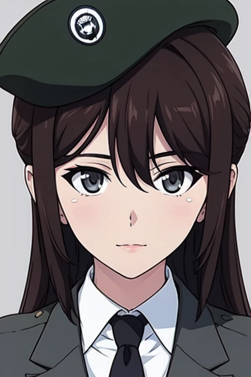 selection university military uniform, military black beret, dark gray jacket, white shirt, black necktie, black long sleeves, black pencil skirt, grey socks, lace-up boots