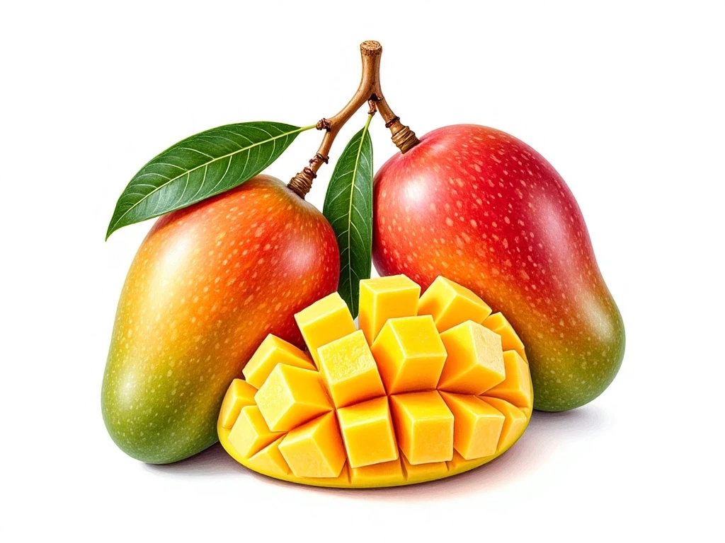 Realistic fruit illustrations, mango arrangement, gradient colors, glossy surfaces, green leaves, plain white, realistic shading.