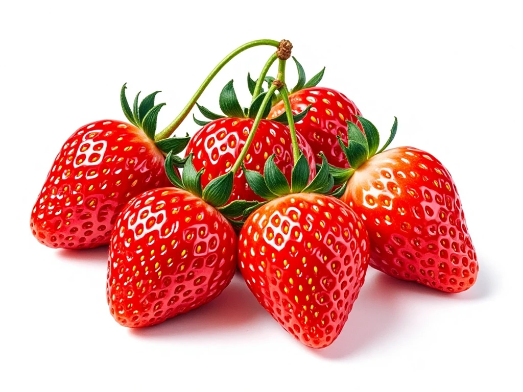 Realistic fruit illustrations, strawberry cluster, lush greenery, soft lighting, realistic textures, isolated on white, high resolution.