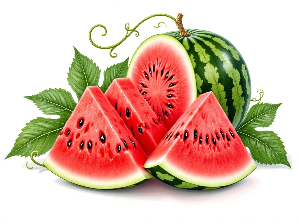 Realistic fruit illustrations, watermelon slices, fresh red flesh, curly vines, bright green rind, simple setting, lifelike details.