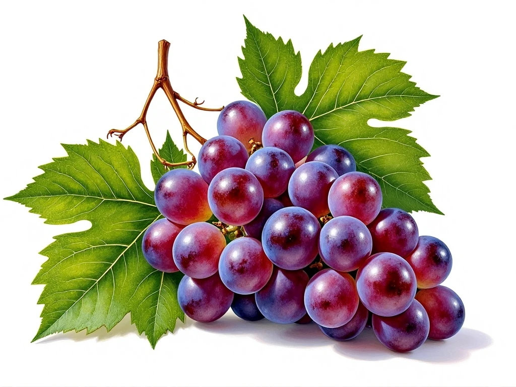Realistic fruit illustrations, grape bunch, rich purple hues, detailed vines, natural shadows, clean backdrop, artistic rendering.