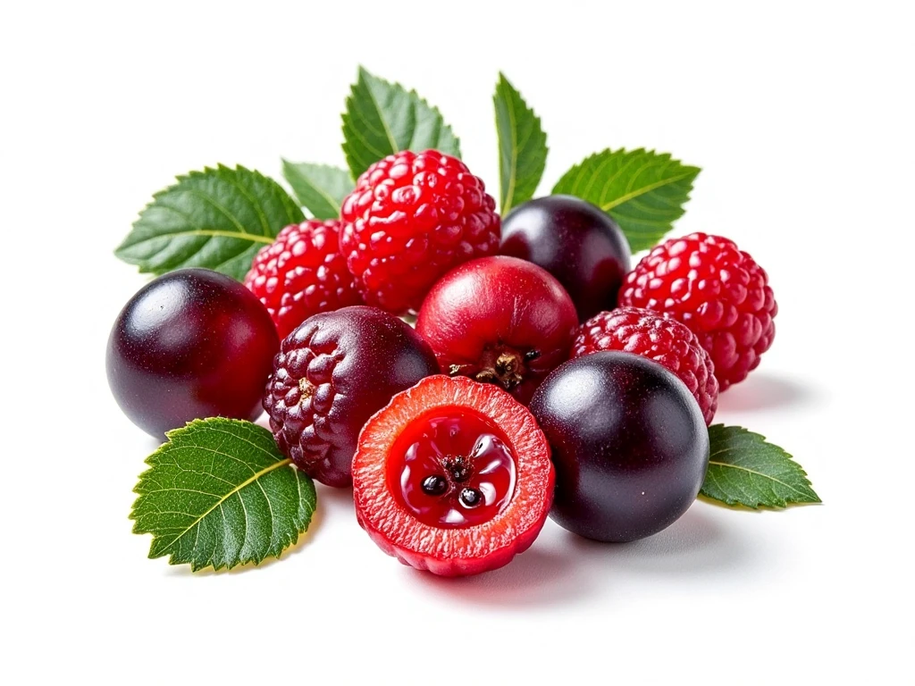 Realistic fruit illustrations, raspberry collection, deep red berries, green leaves, natural textures, white backdrop, vivid look.